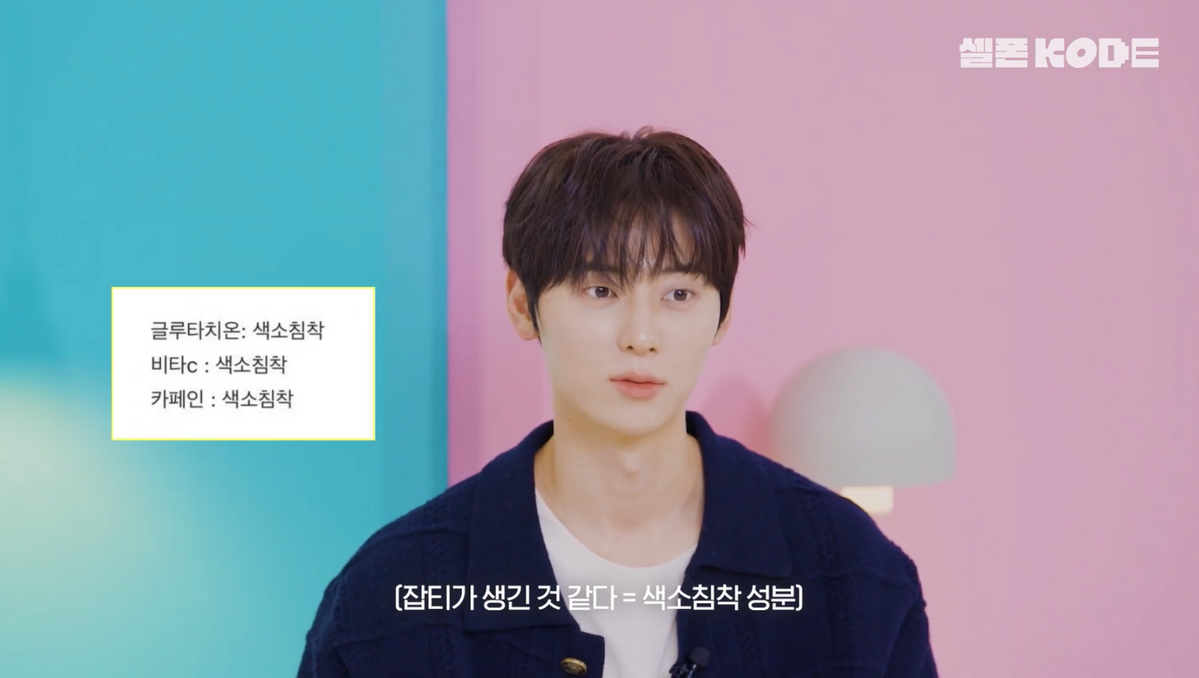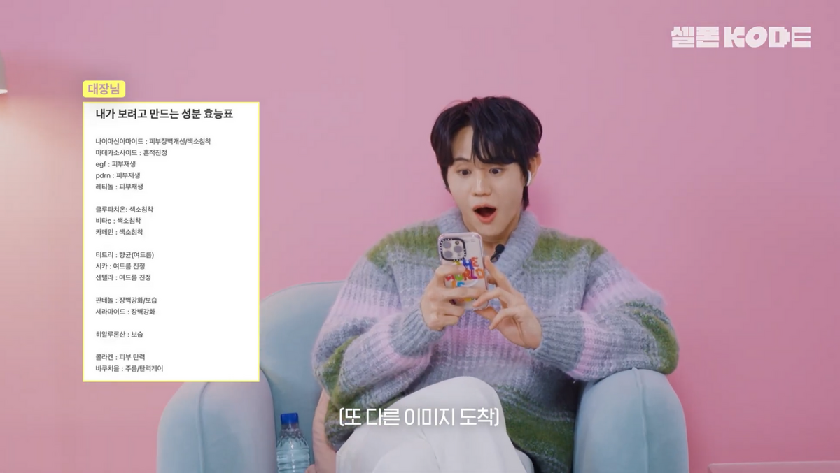 어려운 말로 포장한 상세 페이지 재질이 아닌, 피부 상태 -> 필요한 성분으로 바로 연결되는 매우 심플한 정리본이라 뷰알못도 쉽게 알 수 있을 정도. 황민현은 필요할 때 마다 꺼내보는 이미지라며, 대선배 양요섭한테도 투척했다. 이를 본 원조 동안남은 입을 다물기 힘들었다는 후문. 그날의 피부 컨디션을 먼저 점검하고, 지금 내 피부에 부족한 게 뭔지 생각해본 뒤 성분표와 대조해 제품을 고르는 이 남자. 얼굴이 황민현인데 어찌 이리 뷰티 전교 1등인지 놀라울 지경이다.