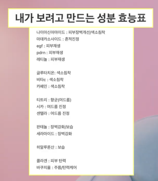 - 티트리·시카·나이아신아마이드 등 피부 고민별 핵심 성분을 정리해 맞춤 케어를 실천한다.