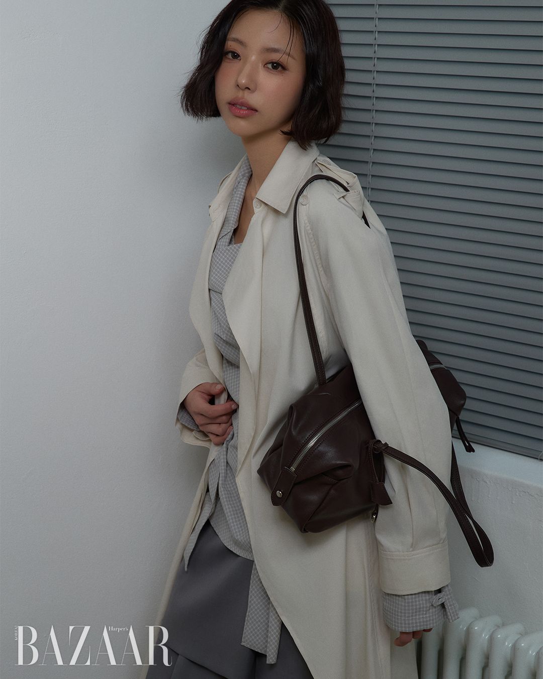 벨티드 롱 트렌치코트는 32만8천원, 체크 블라우스는 21만8천원, 랩 미니스커트는 15만8천원, 엘바 숄더백은 33만8천원 모두 Joy Gryson.