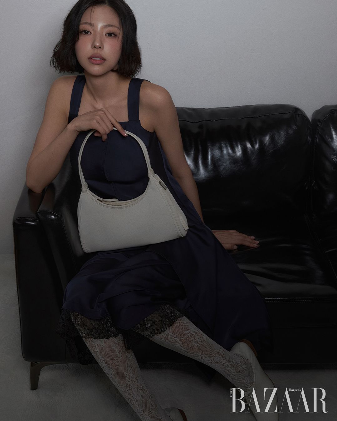 투웨이 니트 톱은 19만8천원, 턴락 장식의 헤일로 사첼백은 32만8천원, 링은 가격 미정 모두 Joy Gryson. 화이트 쇼츠와 니삭스는 에디터 소장품.