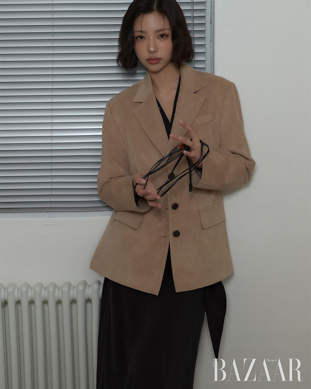 오버핏 스웨이드 재킷은 29만8천원, 블랙 니트 카디건은 19만8천원, 스카프 디테일 롱스커트는 12만8천원 모두 Joy Gryson.