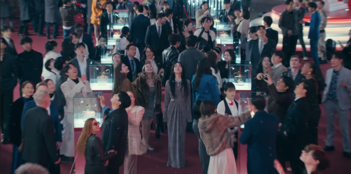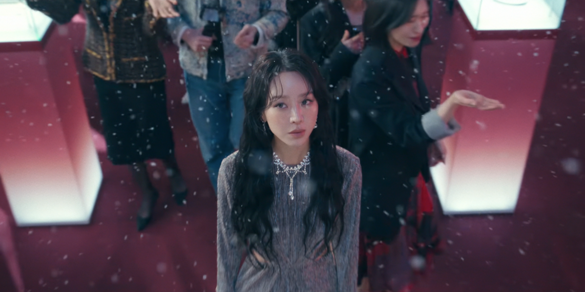 부두아 행사 장면에서 시선을 사로잡은 아이템은 디얼뮤즈의 리에 실버 크리스탈 파티 넥 초커. 촘촘히 세팅된 크리스털 디테일이 네크라인에 섬세한 포인트를 더한다. 특히 흩날리는 눈발과 어우러진 초커의 반짝임이 자연스럽게 부각되며, 신혜선 룩의 전체적인 무드를 한층 더 고급스럽고 드라마틱하게 끌어올렸다.
