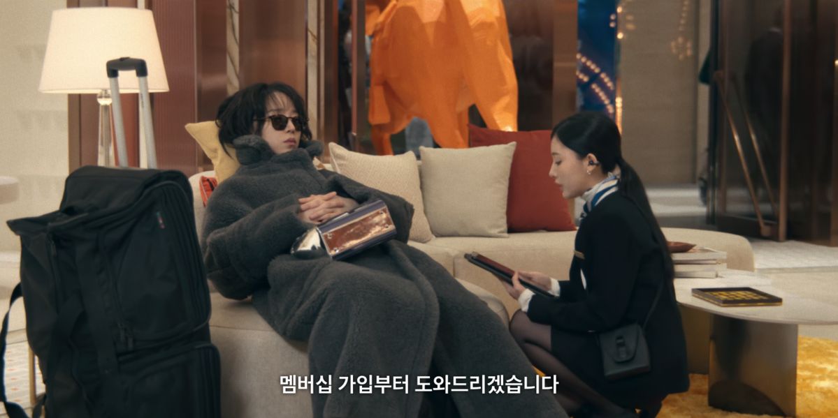 점점 더 확고해지는 사라 킴의 존재감. 이 장면에서 신혜선은 한층 강해진 여성 사업가의 면모를 드러낸다. 손목에는 위블로의 빅뱅 포르토 워치를, 가방은 루이 비통의 쿠상을 선택했다. 볼드한 워치와 체인 디테일이 돋보이는 백이 어우러지며 시크한 무드를 완성한다.