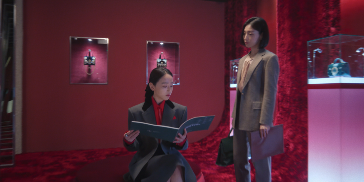 앞선 장면과는 다른 태도를 보이는 목가희. 그는 1화에서 강렬한 인상을 남겼던 디올 레이디 아트 #2를 구입하기 위해 디파짓을 내민다. 소심함 대신 당당함을 택한 순간, 그의 표정과 분위기 역시 달라진다. 이 장면에서 착용한 재킷은 이자벨 마랑의 델피나 재킷. 차분한 그레이 컬러에 퍼프 디테일이 더해져 페미닌한 실루엣을 완성한다. 치열함을 드러냈던 이전 룩과 달리, 한층 정돈된 무드를 선보였다.