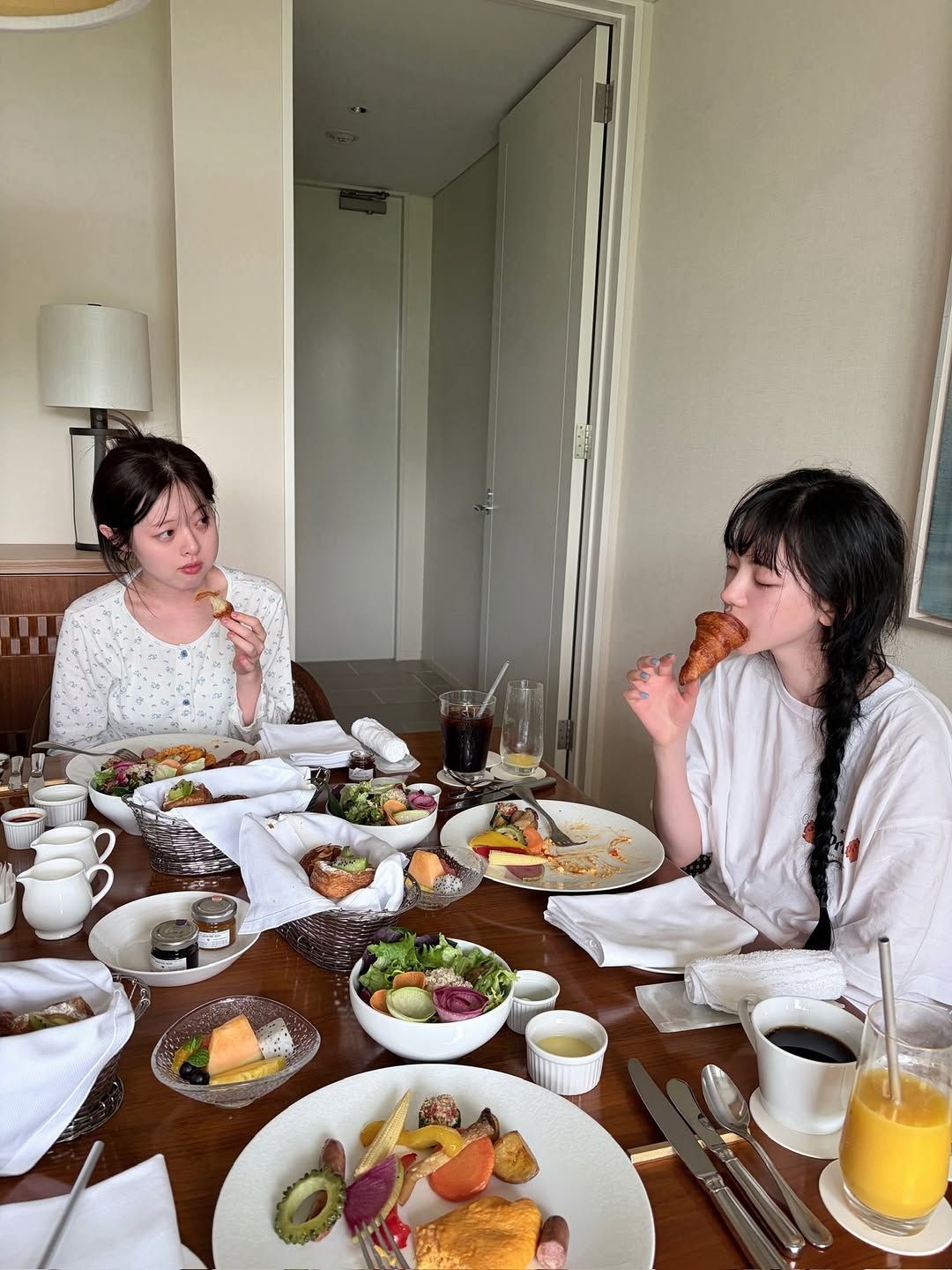 졸리지만 조식은 먹어야 하는 우리와 다를 바 없는 친근한 모습으로 웃음을 자아낸 카리나의 여행 마지막 날 사진 속 티셔츠는? 치이카와와 오리온 맥주 콜라보 티셔츠. 어디서나 입기 좋은 편안한 화이트 티셔츠로 가격은 7만원 대이다. 한수아와의 인증샷을 통해 파자마 팬츠와 티셔츠 역시 함께 구매한 것임을 보여준 카리나는 조식을 먹을 때 다른 옷으로 갈아입은 한수아와 달리 잠옷 차림 그대로 테이블에 앉은 듯 채 크루아상을 물고 졸고 있어 웃음을 자아냈다.