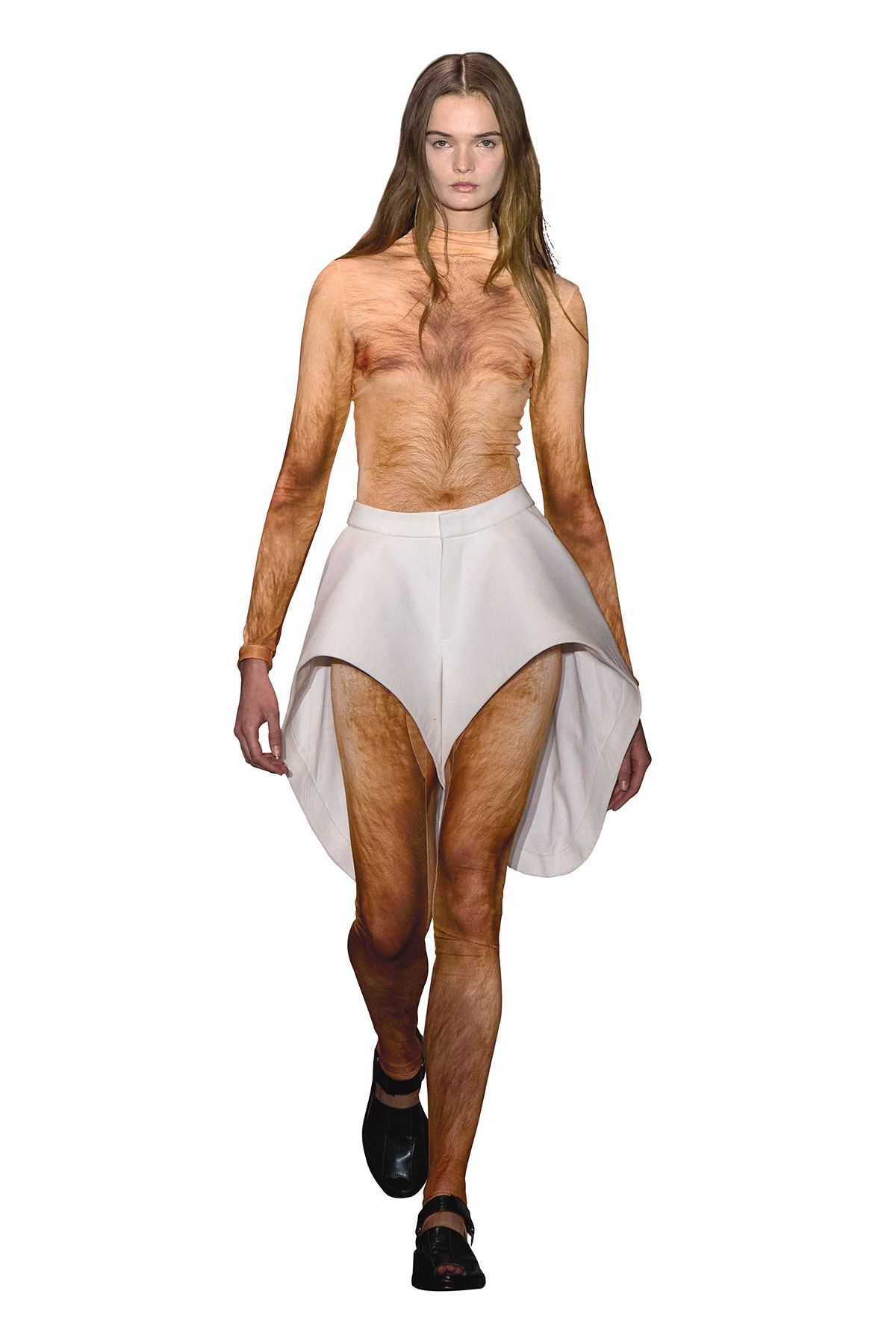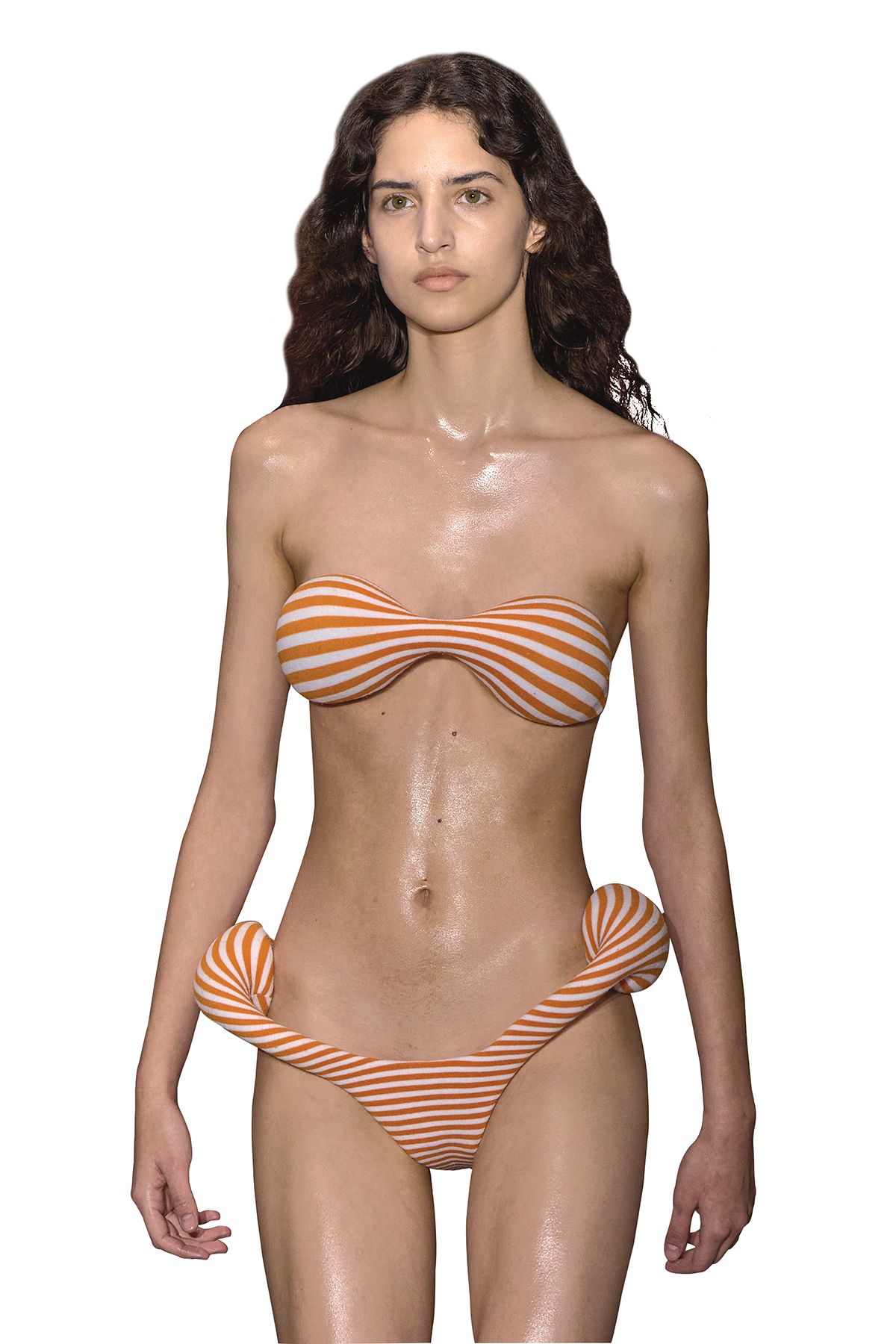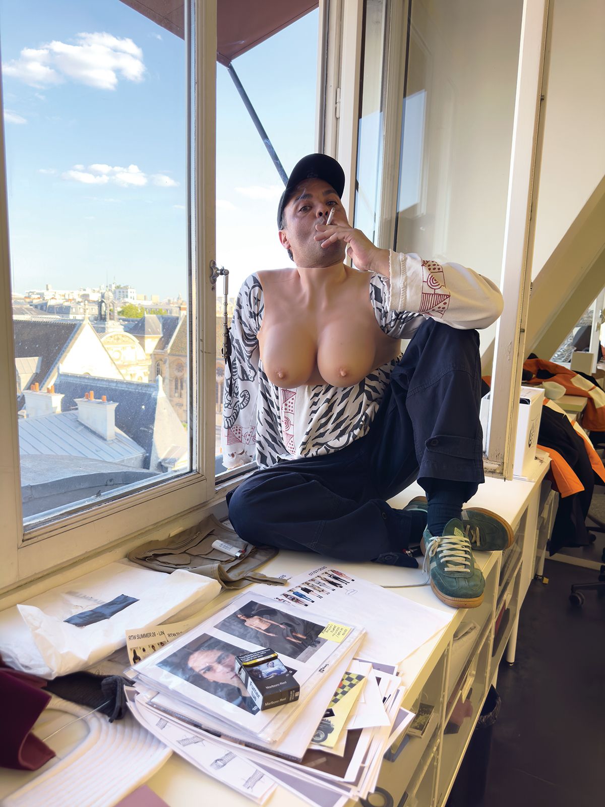 네덜란드 출신 디자이너 듀란 랜팅크가 장 폴 고티에에서 첫 프레타포르테 컬렉션을 선보였다. 한 시대를 이끈 디자이너의 자리를 새로운 세대가 잇는 순간. 데뷔를 앞두고 패션계 기대가 컸던 이유다. 1987년생 랜팅크는 2016년 자신의 브랜드를 론칭했다. 이후 10년도 채 지나지 않은 2021년부터 정식 시즌 컬렉션을 발표하며 빠르게 이름을 알렸다. 이미 존재하는 옷을 자르고 다시 조합하는 방식으로 주목 받았다. 이는 단순한 재활용이 아니다. 과잉 생산과 폐기를 반복하는 패션 산업에 대한 질문이자, 옷을 만드는 방식을 새롭게 생각해 보자는 제안이었다. 사진가 유르겐 텔러가 촬영한 옆 페이지 사진 속 랜팅크는 자신의 스튜디오 창가에 앉아 있다. 카메라를 똑바로 바라보며 태연하게 담배를 태우는 모습은 꾸밈이 없다. 끈이 풀린 운동화부터 그의 2025년 F/W 컬렉션을 대표하는, 드래그 퀸이 착용할 법한 가슴 모양 실리콘 장식 티셔츠까지. 어울리지 않을 것 같은 요소를 끝까지 함께 놓아두는 태도. 사람들이 ‘왜인지 모르겠지만 이해된다’고 느낄 때까지 그는 이 실험을 멈추지 않을 것이다. 런웨이에는 기존 성별 구분을 흐트러뜨리는 옷이 등장했다. 가슴이 달린 수트를 입은 남성 모델과 남성 상반신을 닮은 수트를 입은 여성 모델이 나란히 걸었던 것. 고무처럼 보이는 소재의 패딩 점퍼, 몸에서 떨어져 앞으로 튀어나온 허리선의 청바지까지. 옷은 조각처럼 보였고, 실루엣은 의도적으로 낯설게 설계됐다. 때로 그의 옷은 몸에 밀착돼 또 다른 피부처럼 작동한다. 얼룩말 무늬 보디페인팅 위에 니하이 부츠를 매치해 수영복 팬티를 강조하고, 뱀피 무늬 캣수트는 볼록한 엉덩이 라인과 공기주머니처럼 튀어나온 턱(Tuck) 구조, 턱까지 올라오는 깔때기형 네크라인으로 모델의 몸을 보호막처럼 감쌌다. 이러한 시도는 1990년대 초반 장 폴 고티에가 탐구했던 아이디어들을 잇지만, 단순한 연장선이 아니다. 활동 시대 때문에 발생한 차이는 아니다. 고티에는 스승 곁에서 배우는 전통적 파리 패션 하우스 시스템 안에서 성장했다. 반면 랜팅크는 암스테르담 패션 기관(AMFI, Amsterdam Fashion Institute), 샌드버그 인스티튜트(Sandberg Institute), 게릿 리트벨트 아카데미(Gerrit Rietveld Academie) 둥 네덜란드 디자인 교육 환경에서 자랐다. 특히 샌드버그 인스티튜트 재학 시절에 수강한 ‘패션 매터스(Fashion Matters)’ 과정은 패션이 놓인 지속 불가능한 구조를 분석하고, 물질성과 사회적 책임을 함께 고민하도록 설계된 수업이었다. 당시 학교를 이끌던 디자이너 유르겐 베이(Jurgen Bey)는 랜팅크를 이렇게 기억한다. “하고 싶은 말을 숨기지 않으면서도 매우 섬세한 사람이었어요. 반항적이고 모험적인 태도를 지녔지만, 옷을 통해 생각과 문화적 태도를 분명히 드러낼 줄 알았어요.”
