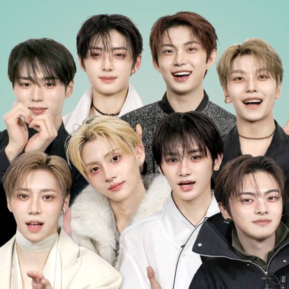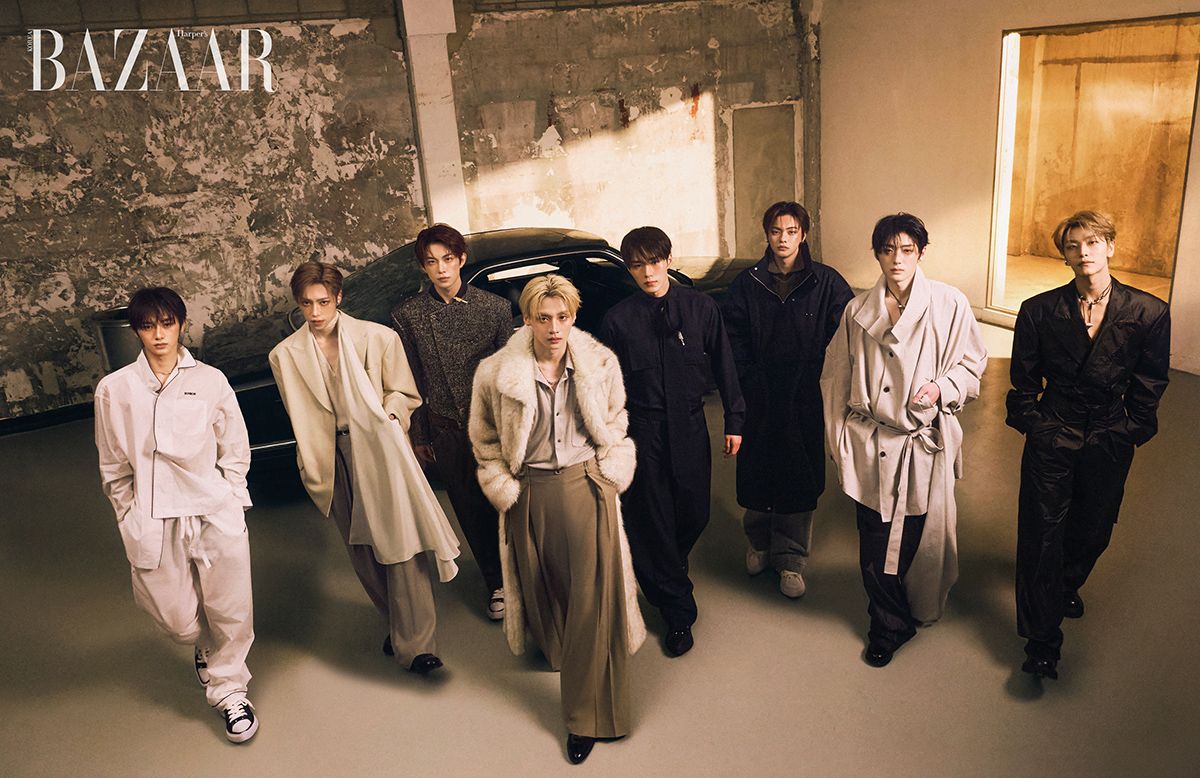 (왼쪽부터) 안신이 착용한 파자마 세트업은 Bonbom × Sleepy Jones. 귀고리, 목걸이, 스니커즈는 모두 Bonbom. 아르노가 착용한 플루이드 재킷, 블라우스, 팬츠, 이어커프, 벨트는 모두 Re Rhee. 슈즈는 스타일리스트 소장품. 건우가 착용한 트위드 크롭트 재킷, 재킷에 단 심벌 핀, 팬츠, 스니커즈는 모두 Bonbom. 상원이 착용한 퍼 코트, 셔츠, 팬츠, 이어커프, 목걸이는 모두 Re Rhee. 슈즈는 스타일리스트 소장품. 준서가 착용한 타이 블라우스, 블라우스에 단 심벌 핀, 팬츠, 스니커즈는 모두 Bonbom. 리오가 착용한 파카, 카디건, 이너로 착용한 셔츠, 데님 팬츠, 스니커즈는 모두 Bonbom. 상현이 착용한 스카프 디테일 재킷, 팬츠, 목걸이는 모두 Re Rhee. 슈즈는 스타일리스트 소장품. 씬롱이 착용한 나일론 재킷, 팬츠, 이어커프, 목걸이는 모두 Re Rhee. 슈즈는 스타일리스트 소장품.
