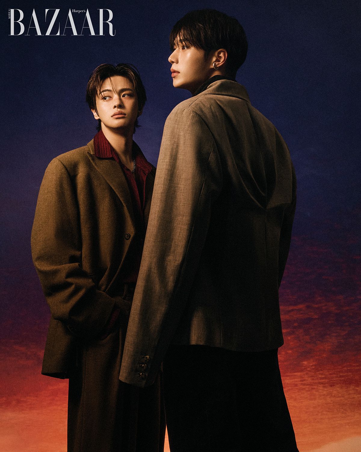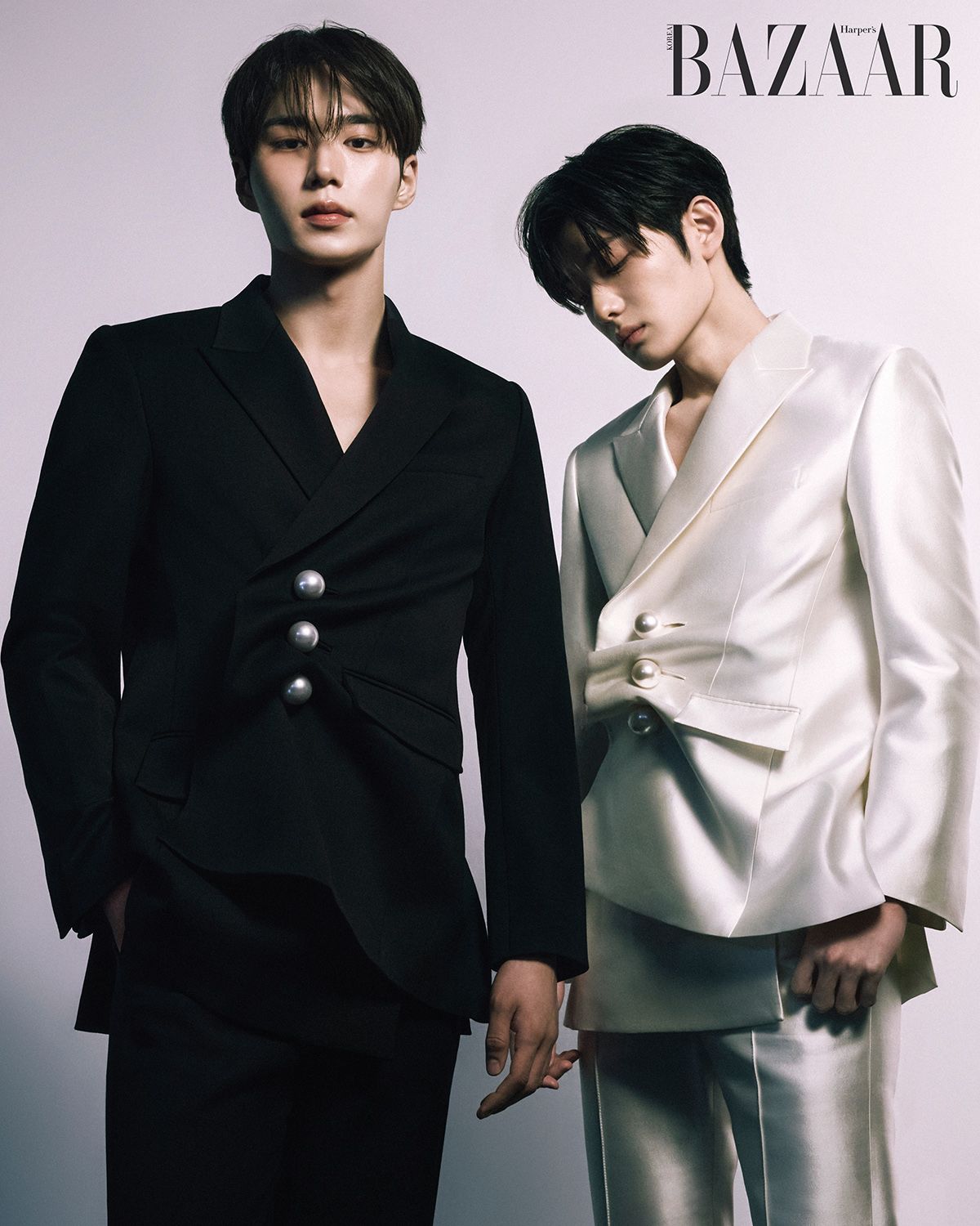 (왼쪽부터) 리오가 착용한 재킷, 셔츠, 팬츠, 목걸이, 준서가 착용한 재킷, 셔츠, 팬츠, 이어커프는 모두 Re Rhee.