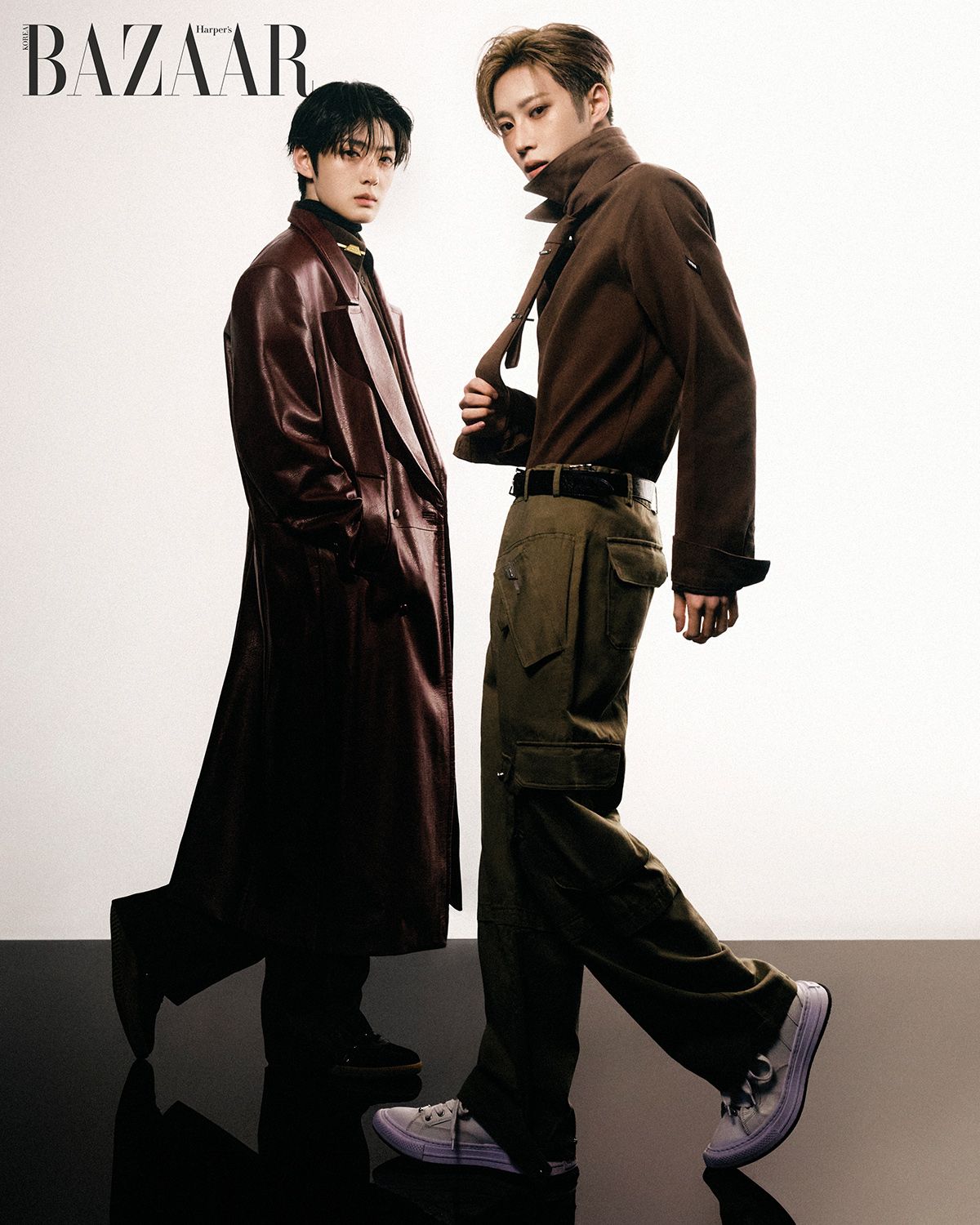 (왼쪽부터) 상현이 착용한 가죽 코트, 캐시미어 터틀넥 톱, 이너 피케셔츠, 셔츠에 단 심벌 핀, 팬츠, 스니커즈, 아르노가 착용한 타이 디테일 셔츠, 카고 팬츠, 벨트, 스니커즈는 모두 Bonbom.