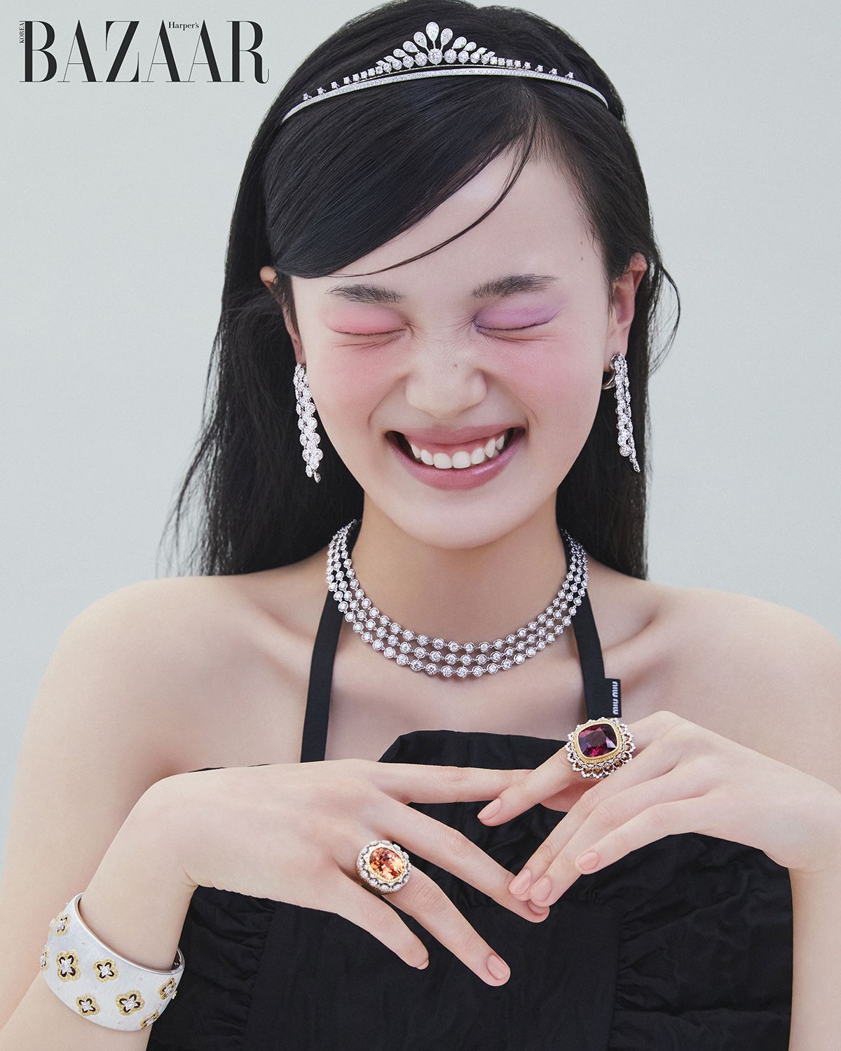 총 7.75캐럿의 다이아몬드가 세팅된 티아라는 Graff. 화이트 골드에 다이아몬드 세팅으로 영롱한 물방울을 형상화한 ‘팔미르’ 이어링, 네크리스는 Van Cleef & Arpels. 왼손 검지에 착용한 18.42캐럿의 가닛이 인상적인 칵테일 링, 오른손 약지에 낀 13.36캐럿의 토파즈 세팅 칵테일 링, 리가토 인그레이빙 기법이 돋보이는 ‘마크리’ 커프 브레이슬릿은 모두 Buccellati.