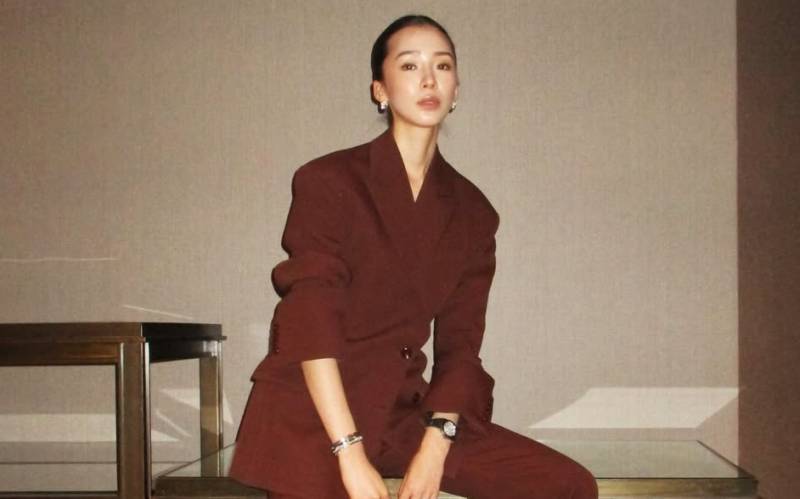 레드 컬러 셋업에 실버, 골드 체인의 벨트를 자유롭게 착용해 강렬한 포인트를 더한 아미 송 / @aimeesong