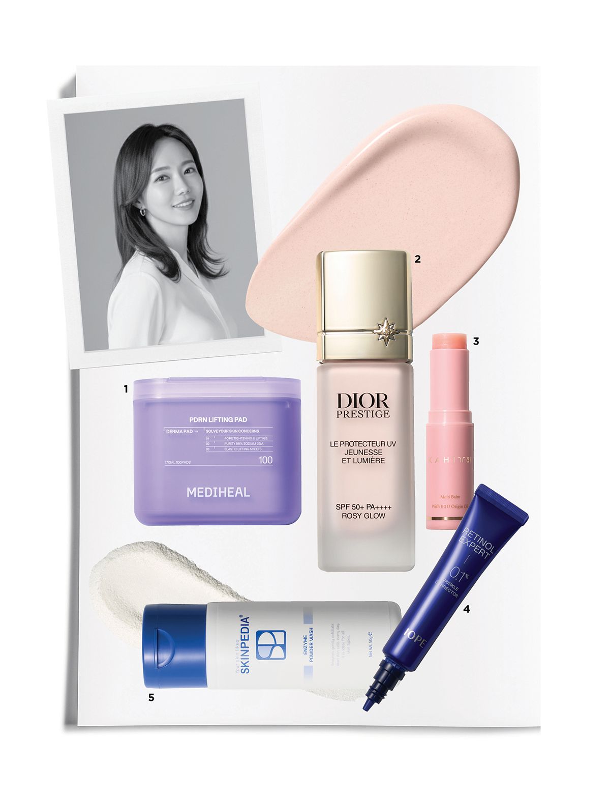 1Mediheal 피디알엔 모공 탄력 패드 2.0 2만6천원. 2Dior 프레스티지 르 프로텍터 유브이 쥬네스 에 뤼미에르 SPF50+/PA++++ 16만3천원대. 3Kahi 멀티밤 4만2천원. 4Iope 레티놀 엑스퍼트 0.1% 링클 코렉터 9만원. 5Skinpedia 엔자임 파우더와시 50g 3만2천원.