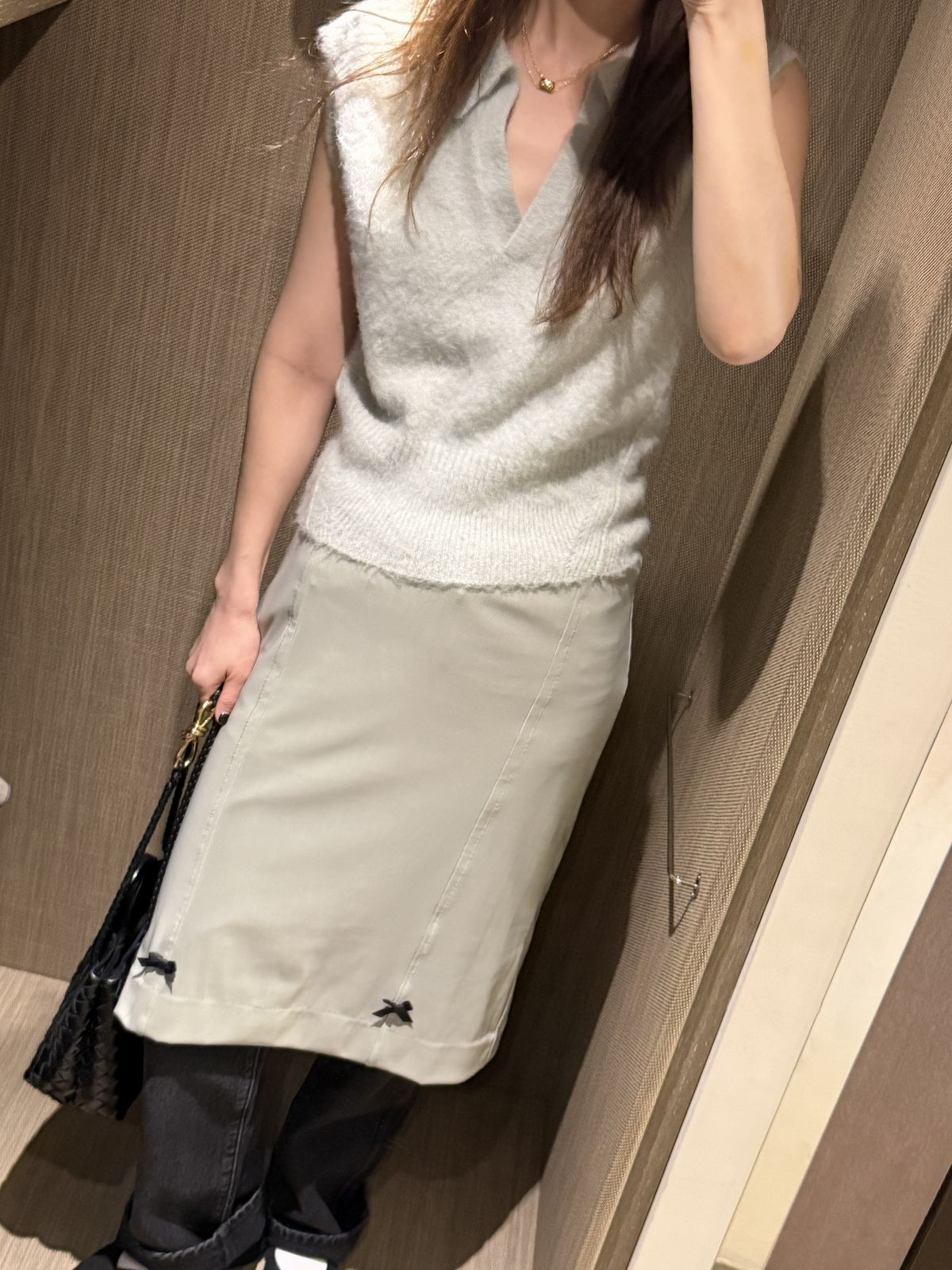 」 LOOK 5. 민트 니트 베스트 + 스커트 레이어드 +그레이 데님 팬츠
