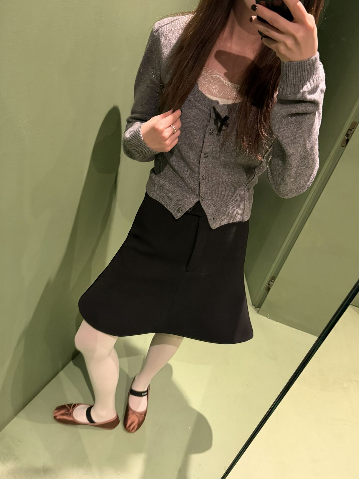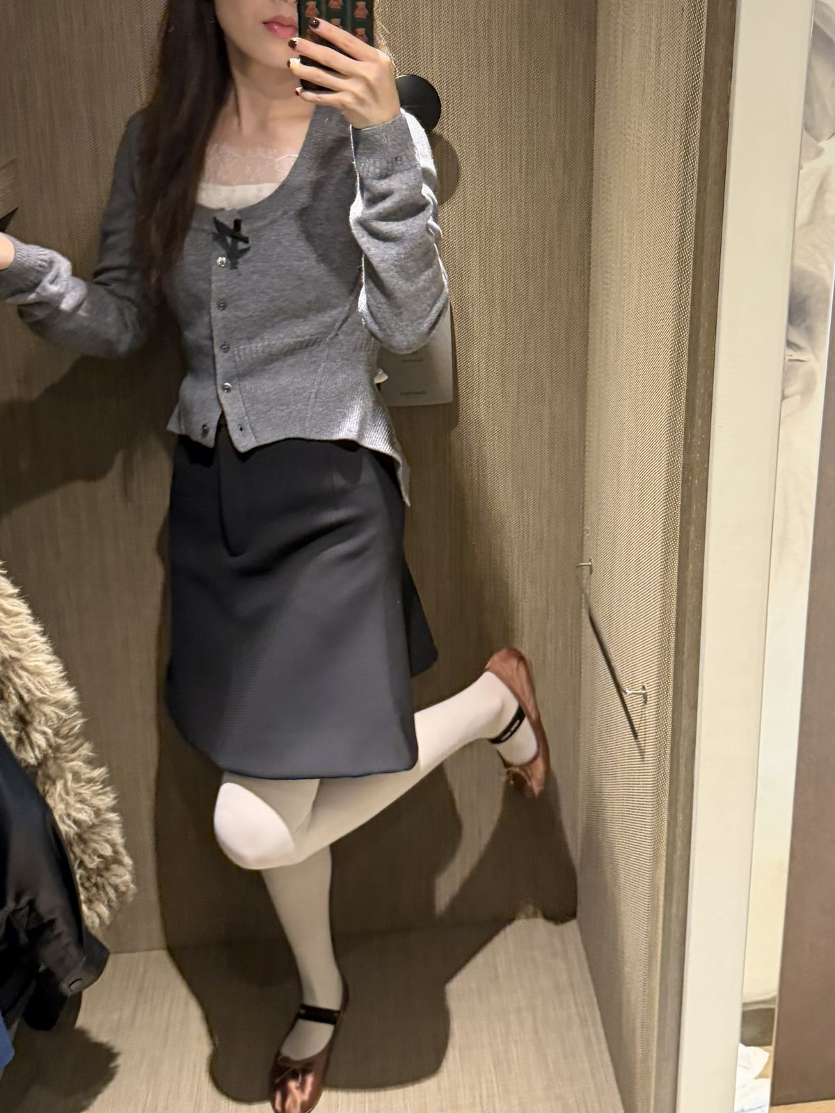 H&M 스튜디오 컬렉션 특유의 섬세한 디테일이 돋보였던 룩. 레이스 트리밍이 더해진 카디건에 미니 플레어 스커트를 매치해 클래식하면서도 여성스러운 분위기를 연출했다. 발레리나 슈즈와 타이즈를 더해 요즘 트렌드인 발레코어 무드를 자연스럽게 완성. 올 봄 데이트룩으로 추천!