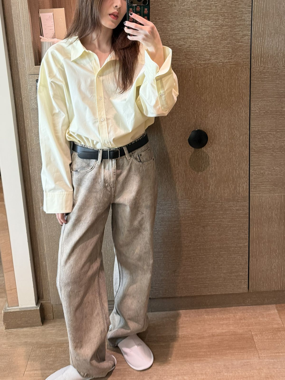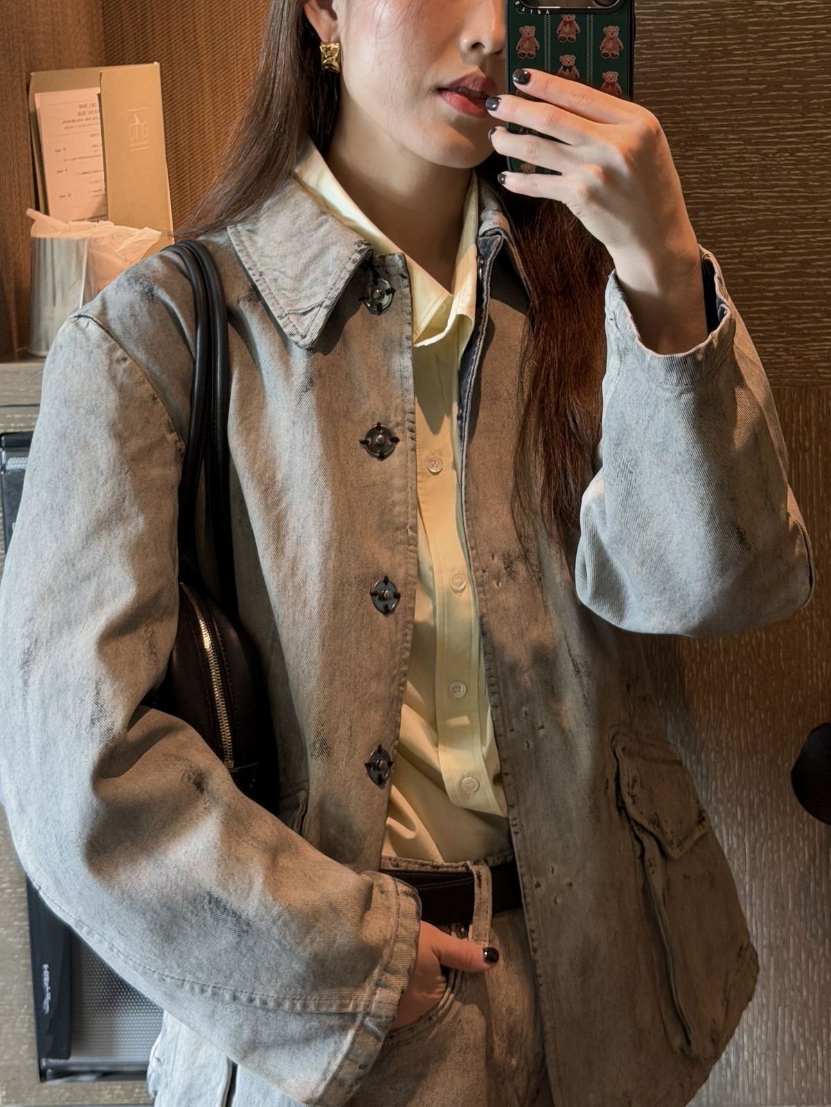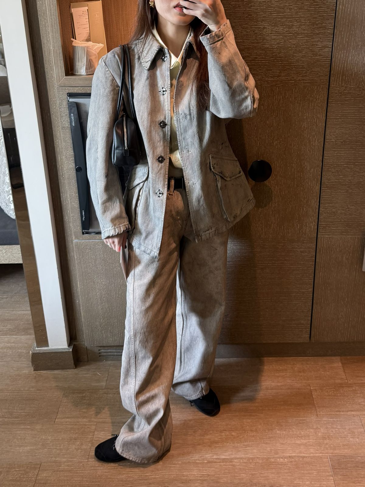 빈티지한 워싱이 돋보이는 페인티드 데님 셋업. 자칫 무겁게 보일 수 있는 톤이지만 안에 옐로 셔츠를 매치해 룩에 경쾌한 포인트를 더했다. 셋업으로 입으면 자연스럽게 스타일링이 완성되는 것이 장점. 소재 역시 생각보다 가볍고 편안해 장시간 촬영과 이동이 많았던 밀란 패션위크 일정에도 부담 없이 입을 수 있었다.