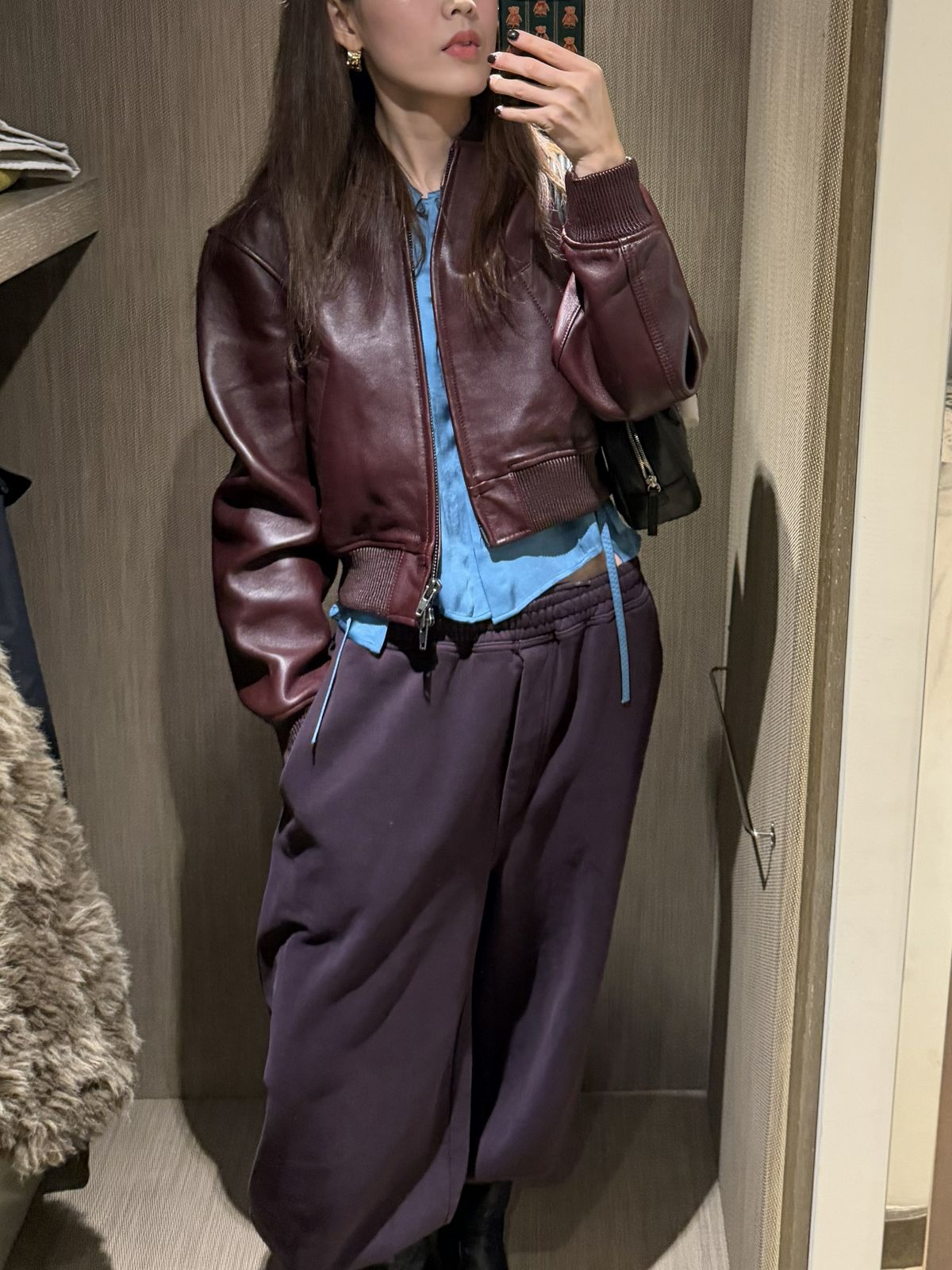 이번 시즌 눈에 띄는 컬러 중 하나인 버건디 레더 재킷. 짧은 기장의 재킷과 조거 팬츠를 매치해 편안하면서도 스타일리시한 무드를 살렸다. 여기에 블루 톤 이너를 더해 컬러 대비를 주니 룩이 훨씬 생동감 있게 완성됐다. 의외로 잘 어울리는 컬러 조합!
