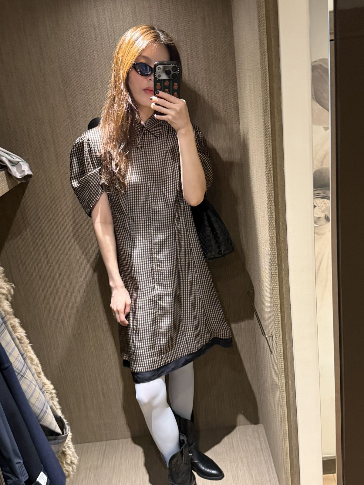 이번 컬렉션에서 특히 눈길을 끌었던 체크 패턴 원피스. 볼륨감 있는 실루엣 덕분에 단독으로 입어도 스타일링이 완성된다. 화이트 타이즈와 부츠를 더해 클래식하면서도 레트로한 분위기를 강조했다. 실제로 입어보니 생각보다 소재가 부드럽고 가벼워 착용감도 무척 편안했다.