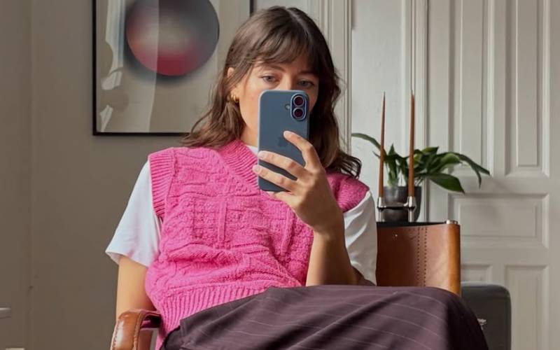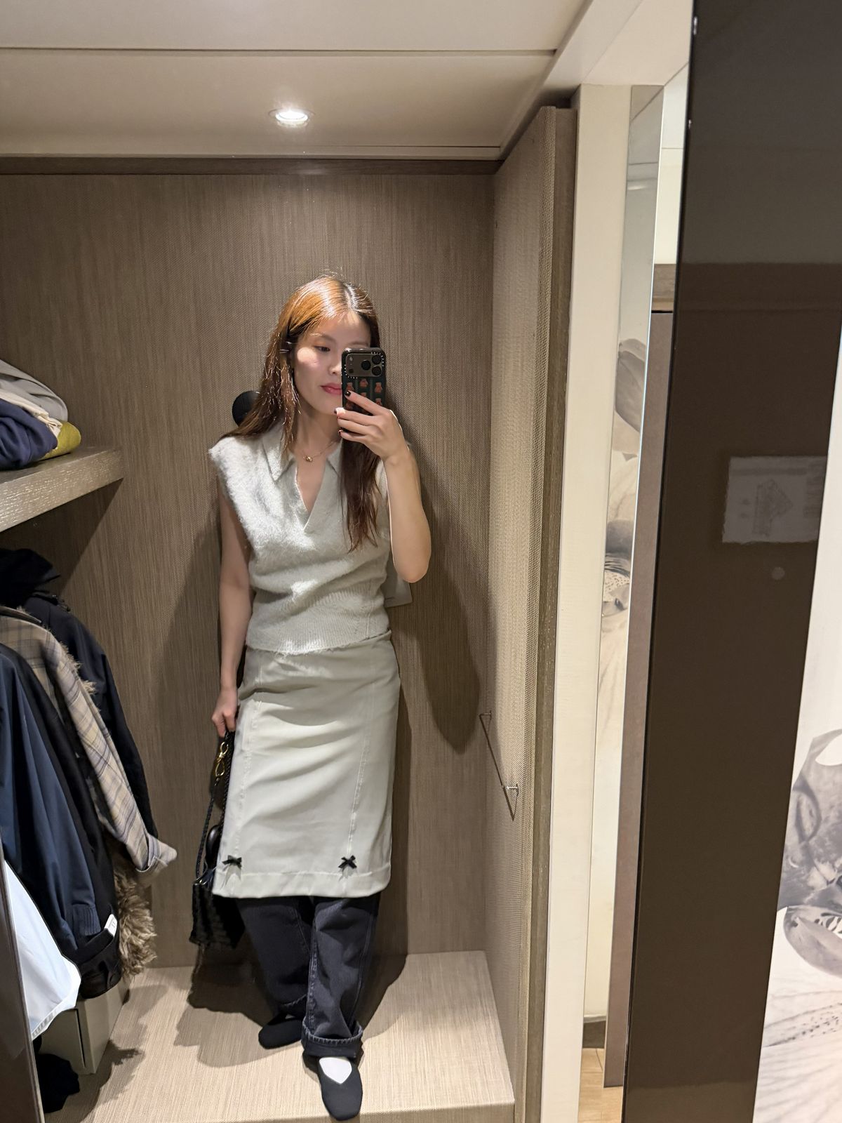 부드러운 텍스처의 니트 베스트에 미디 스커트를 매치한 룩. 미니멀한 컬러 팔레트 덕분에 차분하면서도 세련된 분위기를 연출할 수 있었다. 팬츠를 레이어드해 스타일링에 재미를 더한 것도 포인트. 데일리로도 부담 없이 입기 좋은 룩이다.