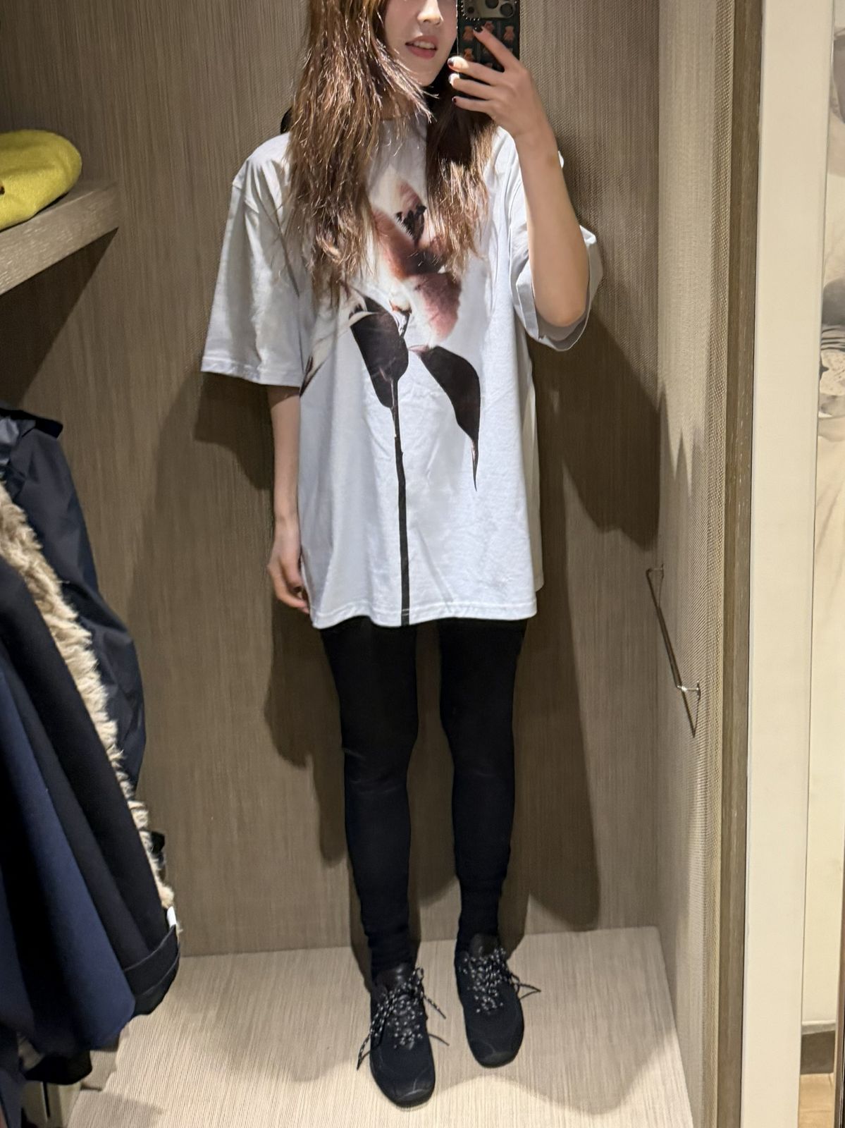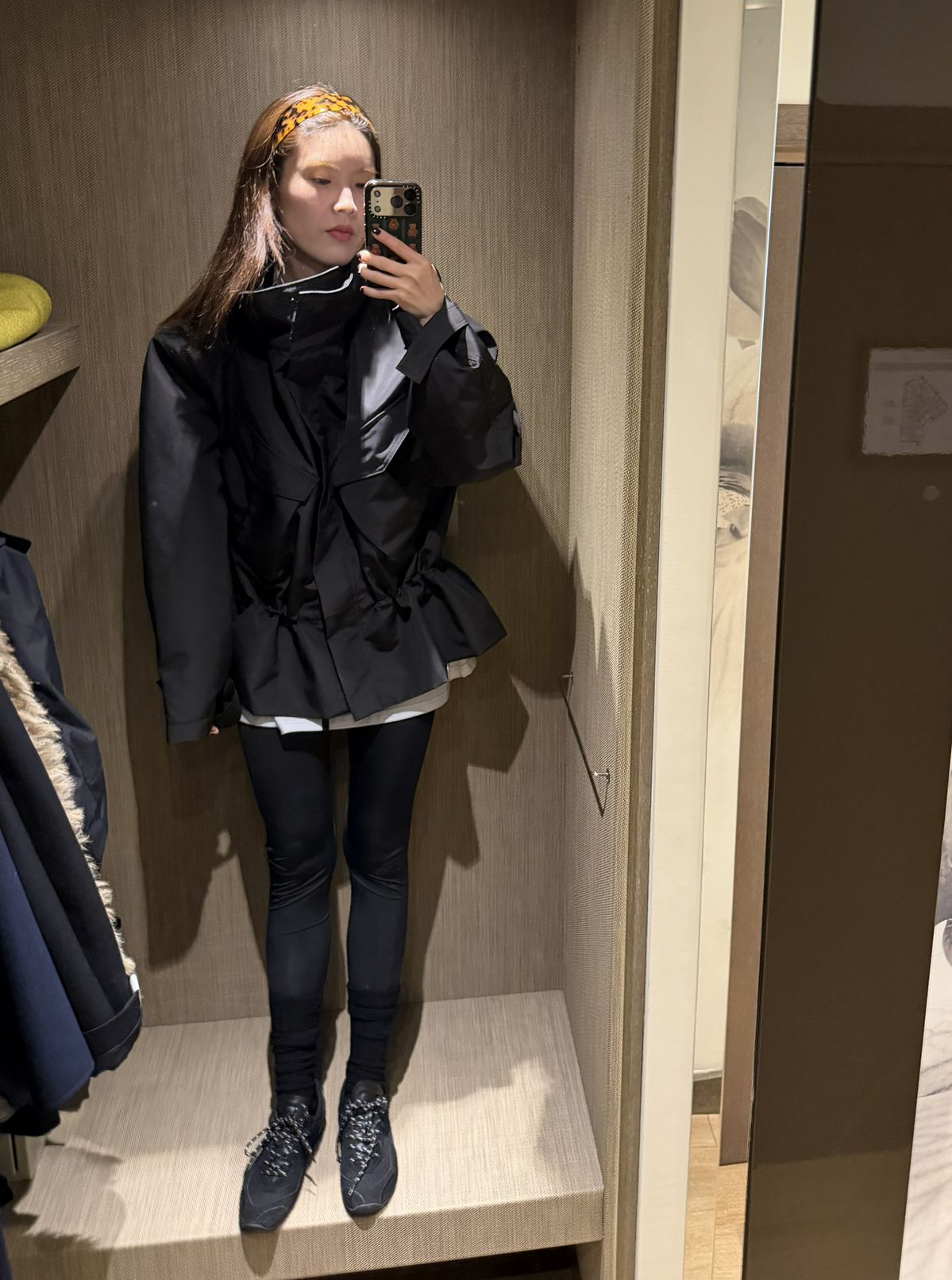 나일론 소재의 볼륨감 있는 실루엣이 인상적인 블랙 재킷. 허리 라인에 볼륨을 더한 구조적인 디자인 덕분에 단순한 블랙 룩도 훨씬 드라마틱하게 연출된다. 슬림한 레깅스와 매치하면 상체의 실루엣이 더욱 강조돼 균형 잡힌 스타일링이 완성된다. 레깅스와 블랙 스니커즈 조합은 생각보다 훨씬 가볍고 편안해 활동량이 많은 날에도 부담 없이 입기 좋았다.