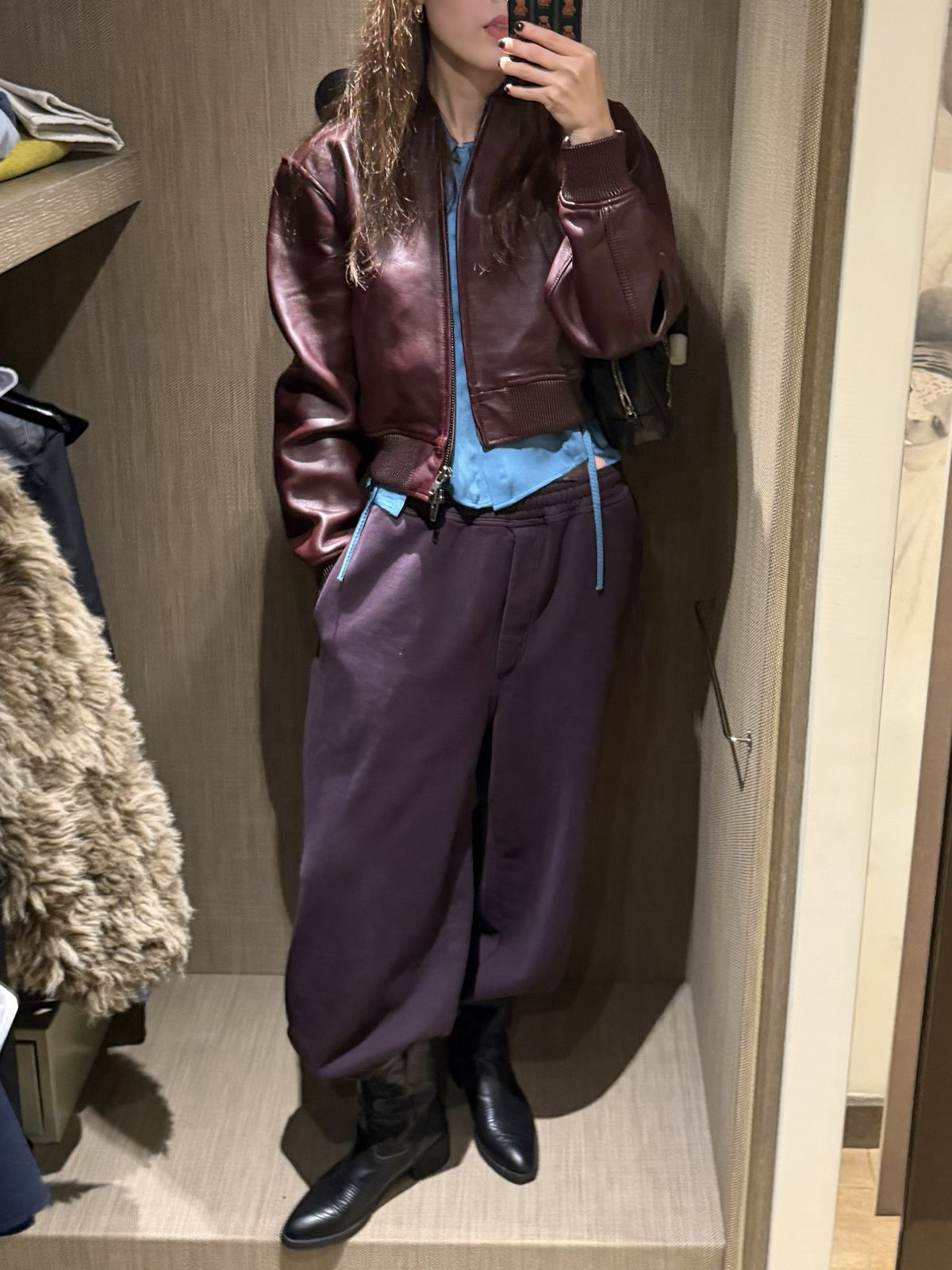 」 LOOK 4. 버건디 레더 재킷 + 조거 팬츠 +블루 실크 셔츠