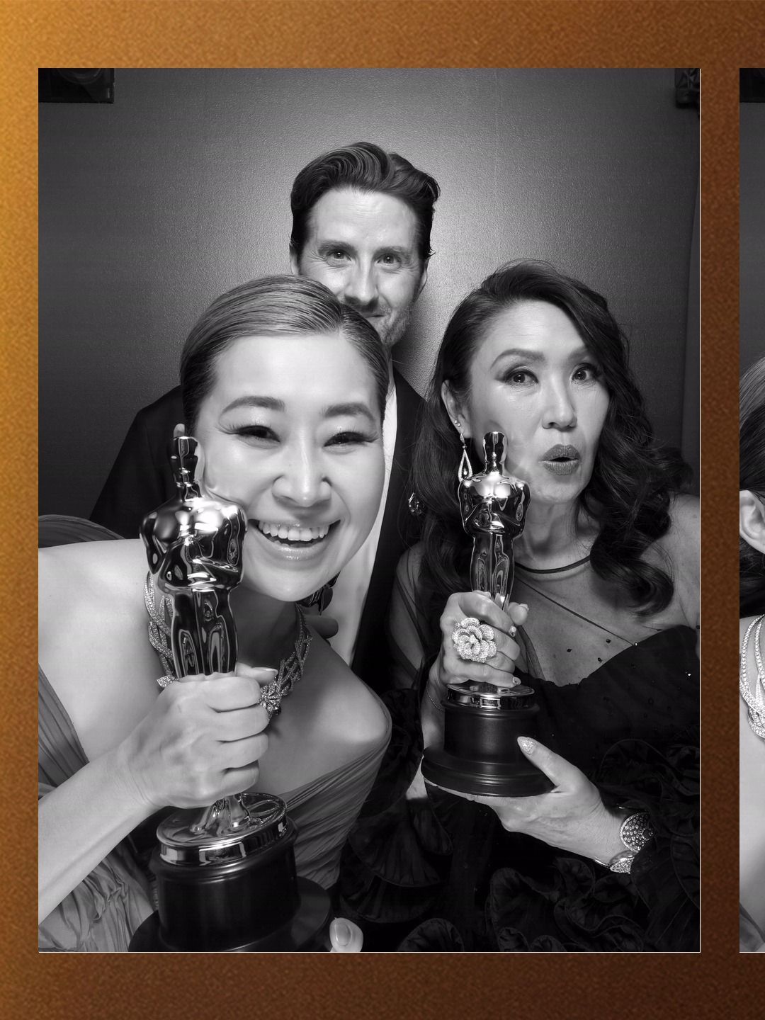 골든글로브에서 2관왕을 해 트로피를 들고 포즈를 취하는 메기강 감독.