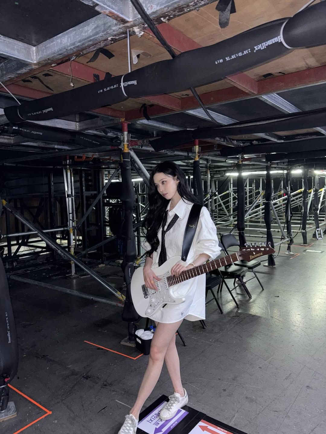 윈터는 화이트 셔츠 드레스를 담백하면서도 여성미 있는 스타일로 완성하는 법을 보여주었다. 클래식한 셔츠 소재와 테일러링의 오버 사이즈 화이트 셔츠 드레스에 타이를 느슨하게 매치해 프레피 무드를 강조하면서도 과하게 포멀해 보이지 않도록 균형을 맞춘 것이다. 화이트 스니커즈를 더한 선택 역시 중요한 포인트. 덕분에 셔츠 드레스가 지나치게 단정해 보이기보다 가볍고 활동적인 분위기로 완성되었다. 셔츠 원피스를 입을 때는 이렇게 타이나 스니커즈 같은 아이템을 더하면 훨씬 위트 있는 스타일을 연출할 수 있다.