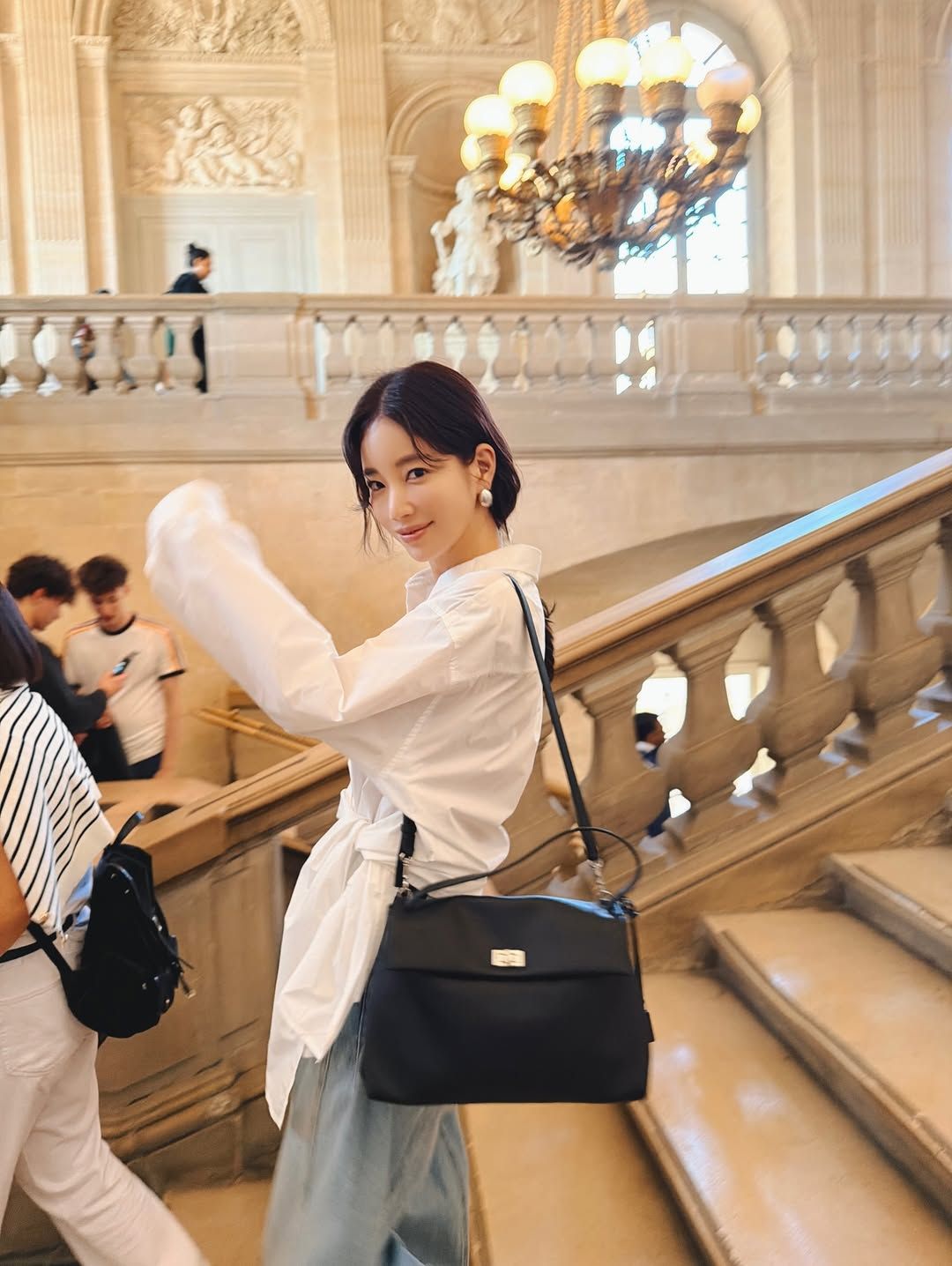 파리를 방문한 기은세는 클래식한 화이트 셔츠에 데님을 매치한 가장 기본적인 조합을 선택했지만, 셔츠의 웨이스트 매듭 디테일로 실루엣에 변주를 준 스타일을 선보였다. 허리 부분을 자연스럽게 묶어 연출하면서 셔츠의 볼륨을 정리하고, 전체 룩이 훨씬 여성스러운 라인으로 완성되도록 한 것이다. 여기에 슬림한 데님보다 여유 있는 라이트 워싱 데님을 선택해 편안한 스타일을 만들었다. 베이직 룩에 충실한 스타일인 만큼 심플하고 볼드한 이어링과 블랙 숄더백처럼 간결한 액세서리를 더해 정돈된 스타일을 보인 것이 포인트다.