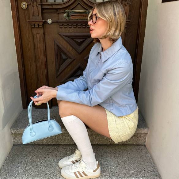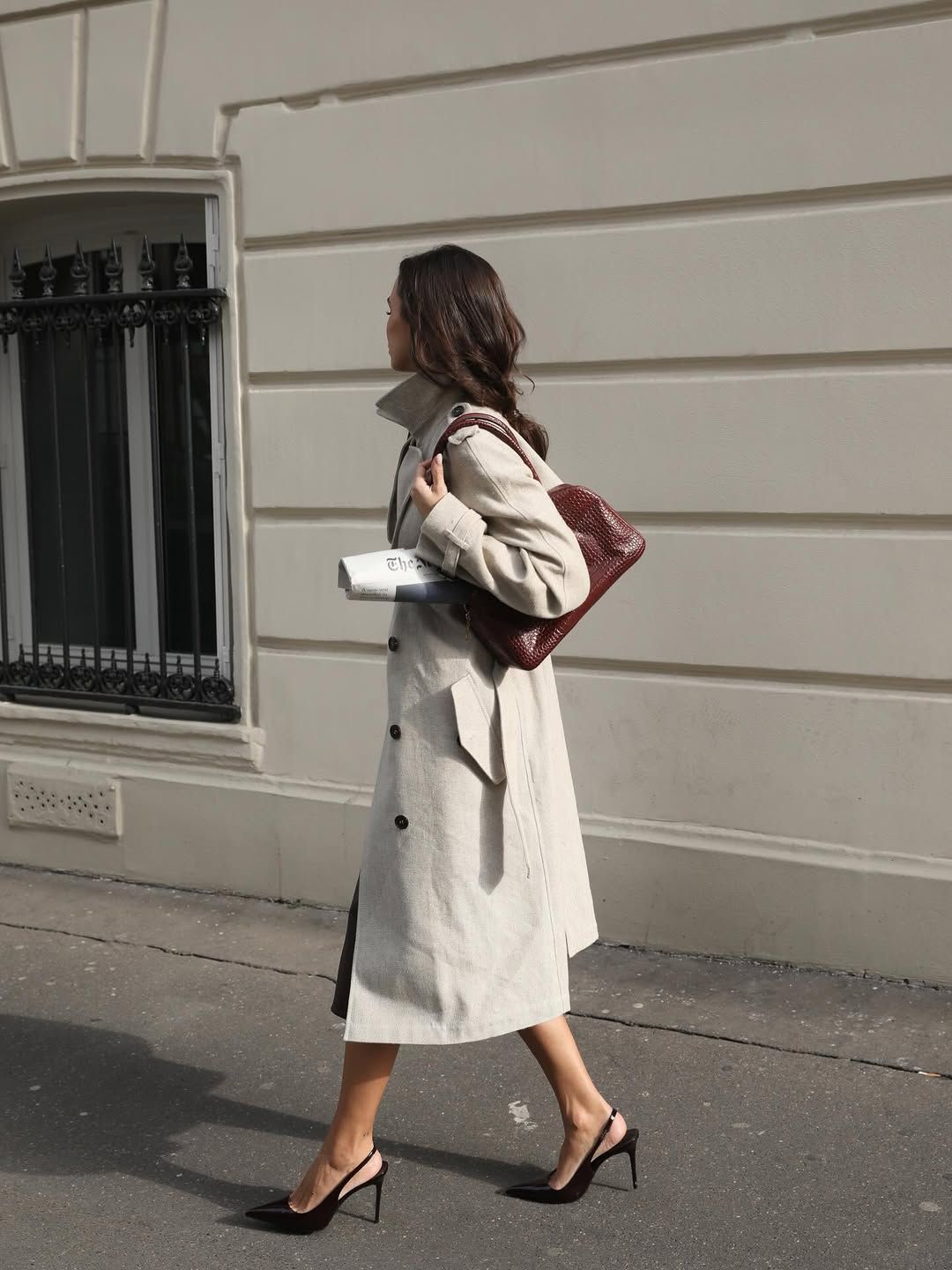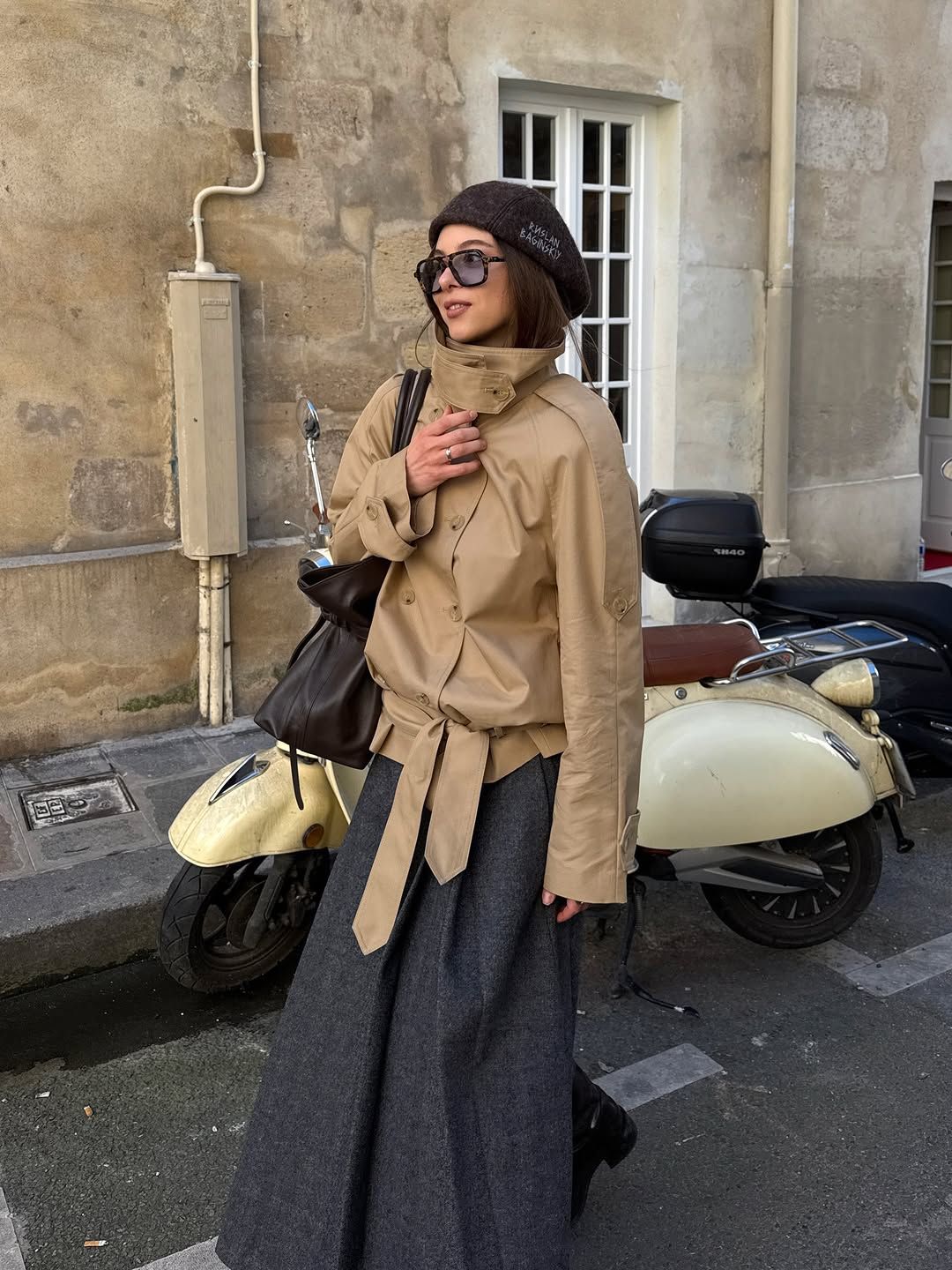 숏 기장의 트렌치에 하이넥 디테일을 더한 디자인은 상체를 단단하게 잡아주며 전체 인상을 또렷하게 정리한다. 허리 아래에서 끊기는 박스형 실루엣 덕분에 볼륨감 있는 롱 스커트와 매치했을 때 비율 대비가 자연스럽게 살아나는 효과가 있다. 벨트를 느슨하게 풀어 무심한 구조를 유지하면 더욱 감각적이다. 크리에이터 이바나는베레모와 스커트를 딥 그레이, 백과 슈즈를블랙으로 통일해 각각의 요소가 분산되지 않아 보이게 선택해 로맨틱한 프렌치 무드를 살렸다.