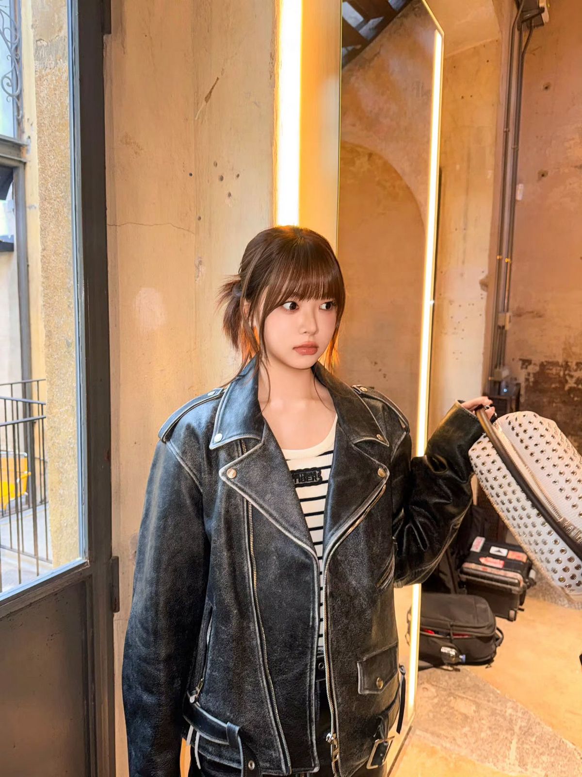 홍은채는 자연스럽게 아래로 뻗친 가시 번에 뱅을 더한 헤어 스타일로 트렌디한 무드의 룩을 연출했다. 숱을 살린 앞머리가 옆머리와 부드럽게 이어지며 영한 무드를 강조하고, 레더 재킷의 큼직한 칼라와 어우러져 얼굴이 한층 작아 보이는 효과를 더했다.