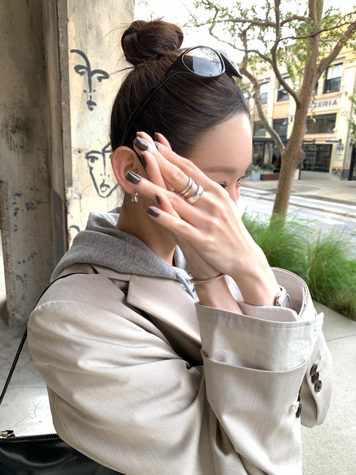 강민경은 잔머리 없이 깔끔하게 올린 하이 번으로 스타일리시한 룩을 완성했다. 슬릭 번보다 살짝 여유 있게 묶어 데일리로도 부담 없이 활용하기 좋다. 가르마는 정수리 앞에서 짧게 끊는 것이 관건. 5 대 5 가르마를 끝까지 길게 이어가면 얼굴이 길어 보이고 두피가 비어 보일 수 있지만, 짧게 정리하면 얼굴 전체의 균형감이 살아난다. 올백 헤어 위에 선글라스를 얹고볼드한 주얼리를 더해 쿨한 스타일링을 완성했다.