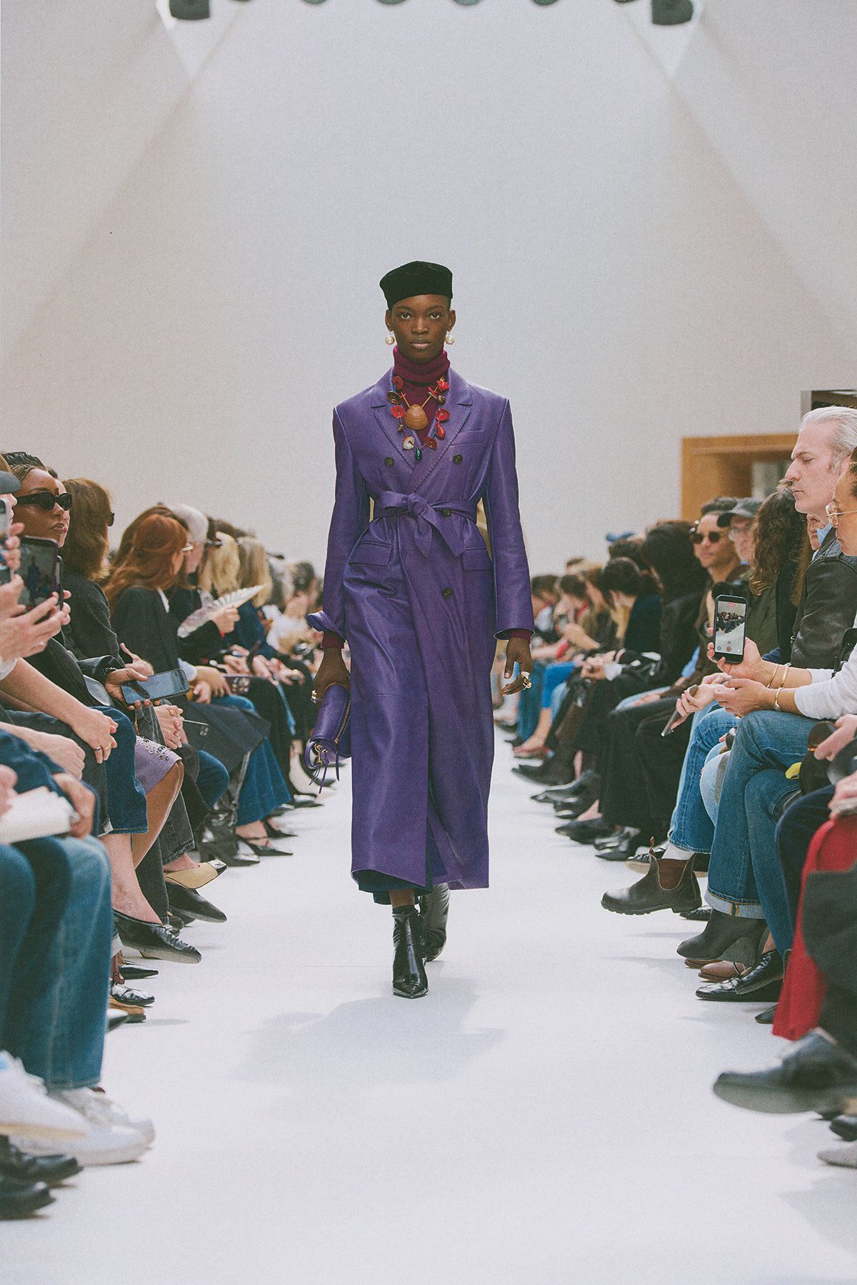 아티스틱 디렉터 마이클 라이더가 세 번째로 선보인 컬렉션의 오프닝 룩이 등장하자 쇼장은 패셔너블한 파리지앵으로 가득 찬 거리로 탈바꿈했다. 턱시도 재킷을 변주한 정교한 테일러드 코트, 구조적인 페도라, 볼드한 이어링, 여기에 무심하게 든 핸드백까지. 라이더는 완전히 새로운 것을 제시하기보다 익숙한 요소를 다시 조합하는 방식에 집중했다. 그는 판타지적인 콘셉트로 컬렉션을 구상하기 보다 셀린느 특유의 스타일 안에서 현실적인 옷차림을 풀어내는 데 초점을 맞췄다. 실제로 오버사이즈 트렌드에서 벗어나 하우스 특유의 절제된 롱앤린 실루엣을 선보였다. 블랙을 중심으로 한 룩에 화이트가 정교하게 뒤섞여 긴장감을 더했고, 티저에 등장했던 레드 컬러를 녹여낸 가방, 라일락 컬러의 아이템이 쇼에 리듬을 더했다. 특히 얼굴을 반쯤 가린 새틴 스카프는 ‘복잡한 내면’을 암시하는 하나의 수단으로 작용했다고 밝히기도 했다. 지극히 현실적인 옷을 바탕으로 했지만 컬렉션은 결코 단조롭지 않았다. 클래식한 트렌치코트에 반짝이는 메탈 드레스를 매치하고 록 시크 풍의 주얼리와 깃털 헤드 액세서리로 변주를 더했다. 여기에 강인한 레오퍼드 코트에 페도라를 씌우거나 가방을 손으로 드는 애티튜드처럼 정형적인 스타일링을 살짝 비틀며 감각적으로 표현하는 등 고심의 흔적이 발견되었다. 지난 시즌 등장했던 플로럴 미니 드레스는 겨울 시즌으로 넘어오며 색감이 한층 바래고 길이는 더 길어졌다. 캐멀, 베이지, 아이보리, 브라운으로 이어지는 차분한 팔레트 역시 계절의 변화를 드러냈다. 무엇보다 이번 컬렉션이 설득력을 가졌던 이유는 과장된 판타지에 머물지 않았기 때문. 쇼를 위한 옷이면서도 그대로 입고 거리에 나설 수 있는 현실성이 돋보였다.
