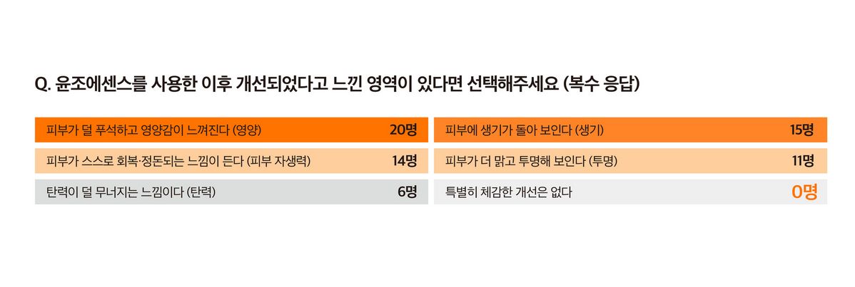 」제아무리 뛰어난 기술이라도 피부 변화를 체감하지 못한다면 의미가 없다. 설화수는 이 지점에서도 명확한 차별점을 갖고 있다. 윤조에센스를 사용한 사람들은 피부 영양감, 생기, 자생력, 투명도 등 다양한 영역에서 개선을 체감했다고 답변했다. 특히 ‘효과를 느끼지 못했다’는 응답이 단 한 건도 없었다는 점에서 피부 컨디션 전반을 끌어올리는 제품으로서의 가능성을 엿볼 수 있었다.