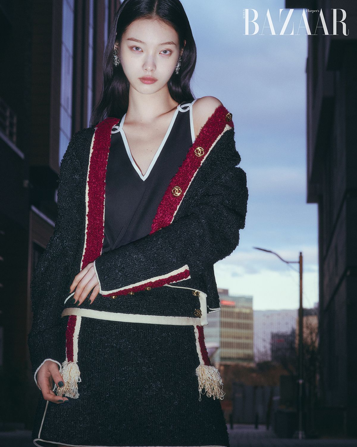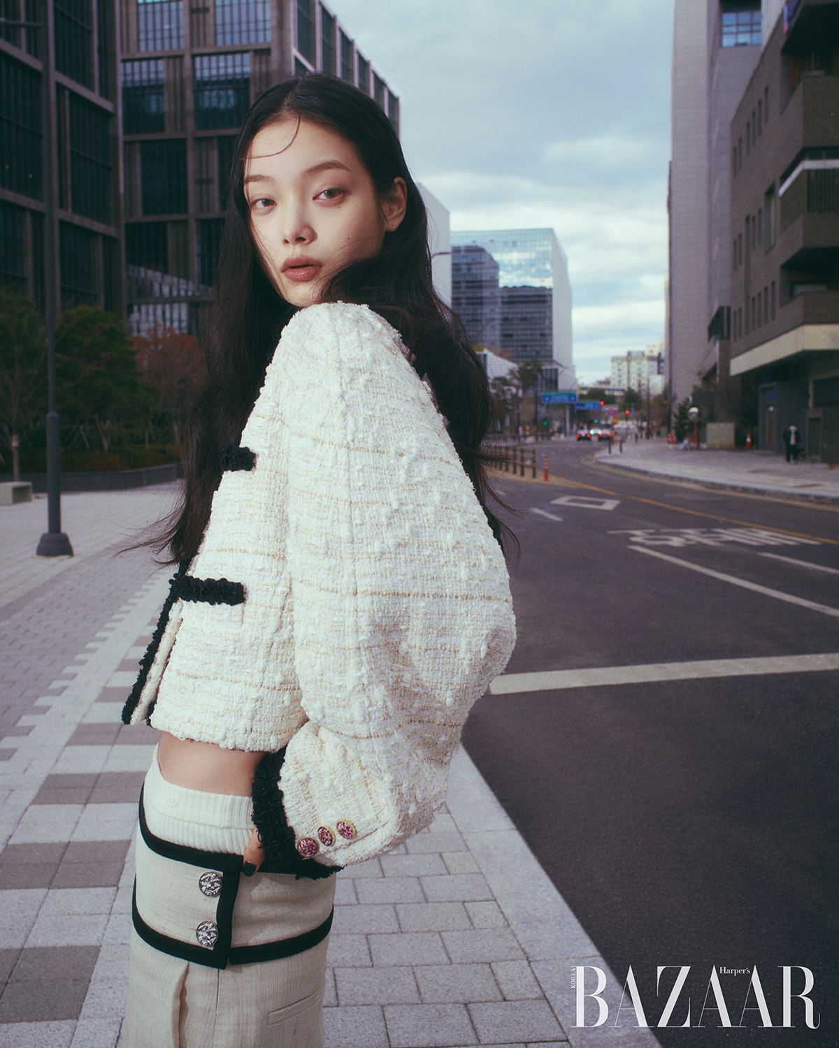 트위드 재킷, 스커트, 니트 브리프는 모두 Chanel.