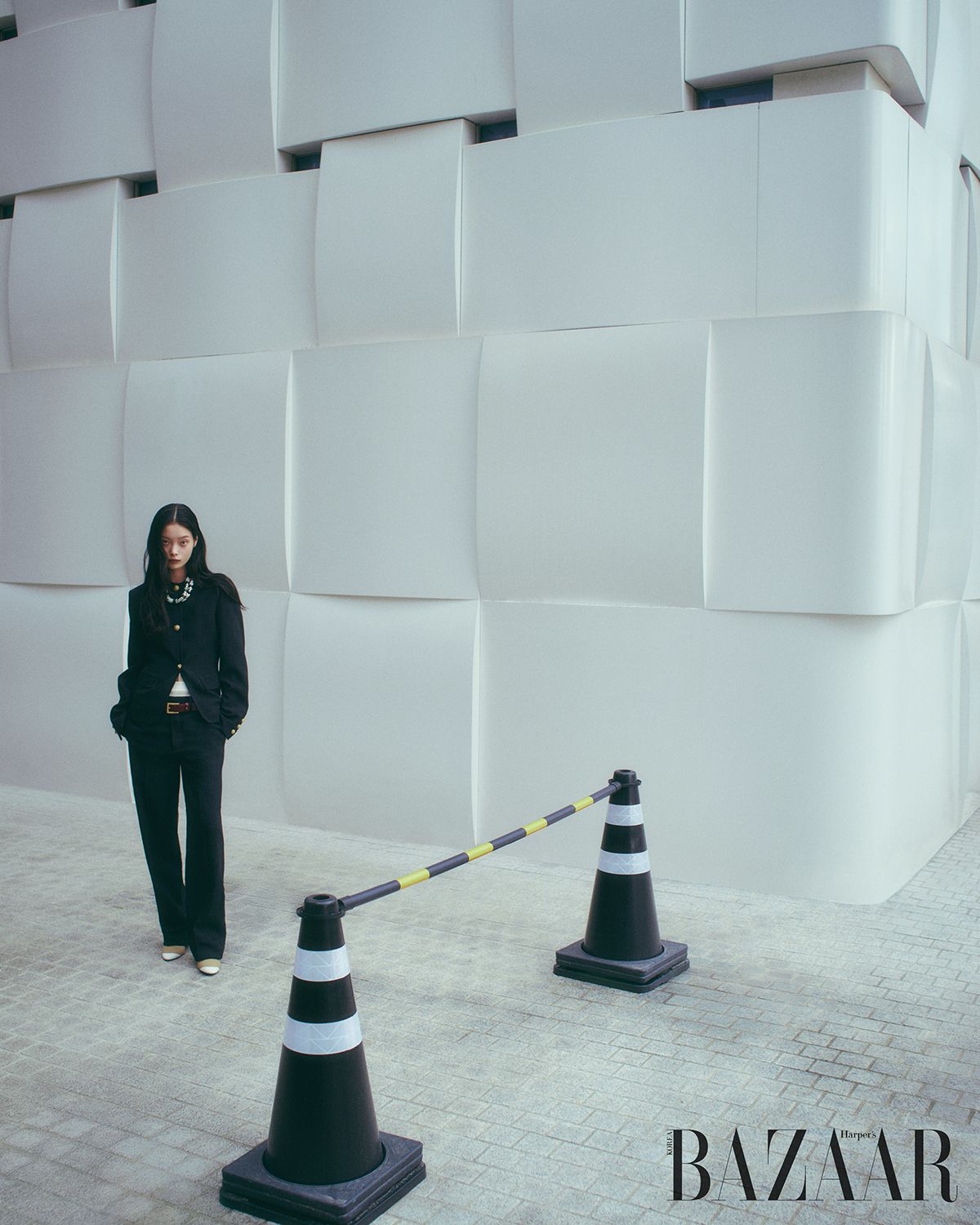 재킷, 톱, 팬츠, 니트 브리프, 레이어드한 메탈 소재 목걸이, 벨트, 펌프스 힐은 모두 Chanel.
