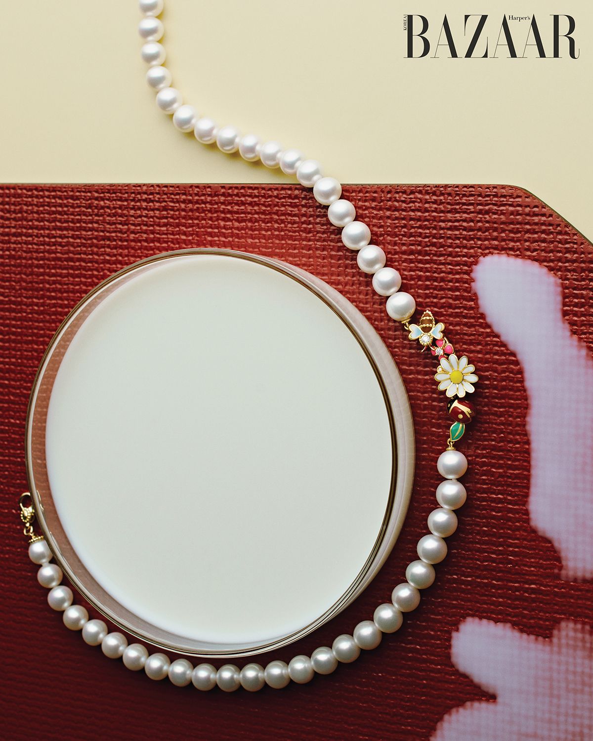 옐로 골드, 다이아몬드, 래커 소재로 완성한 자연물 모티프에 진주로 우아함을 더한 ‘디오레트’ 네크리스는 Dior Joaillerie.