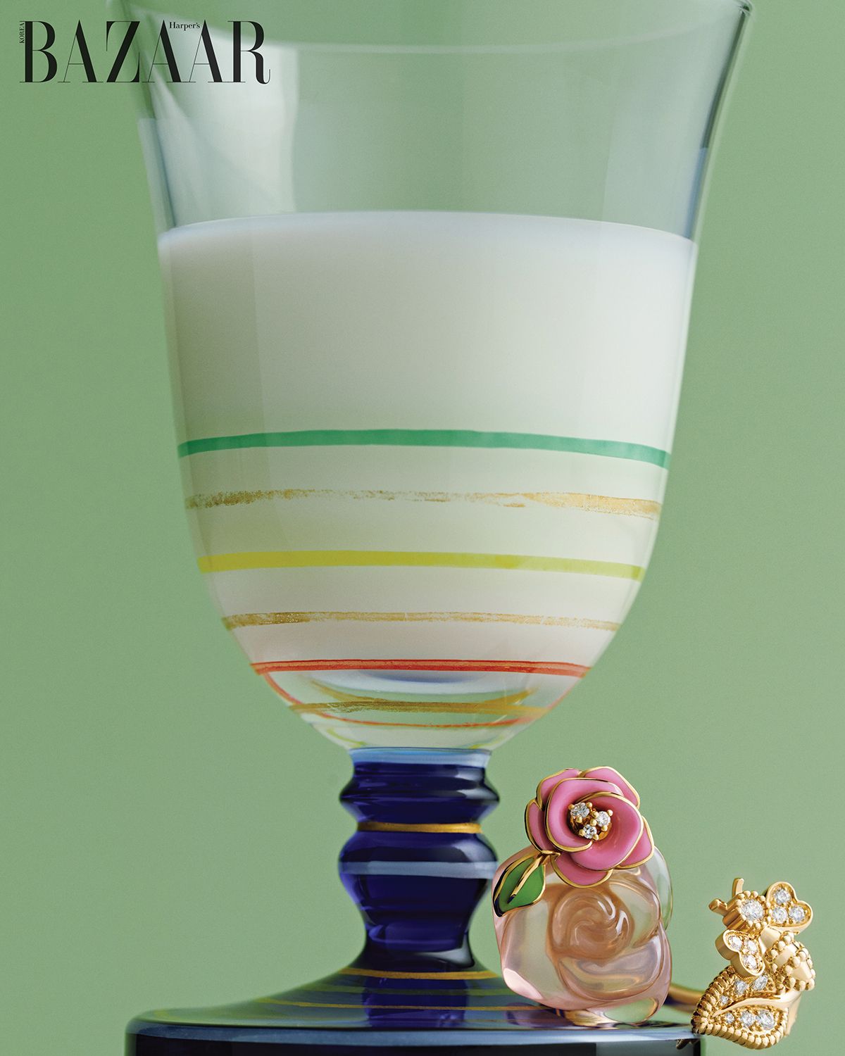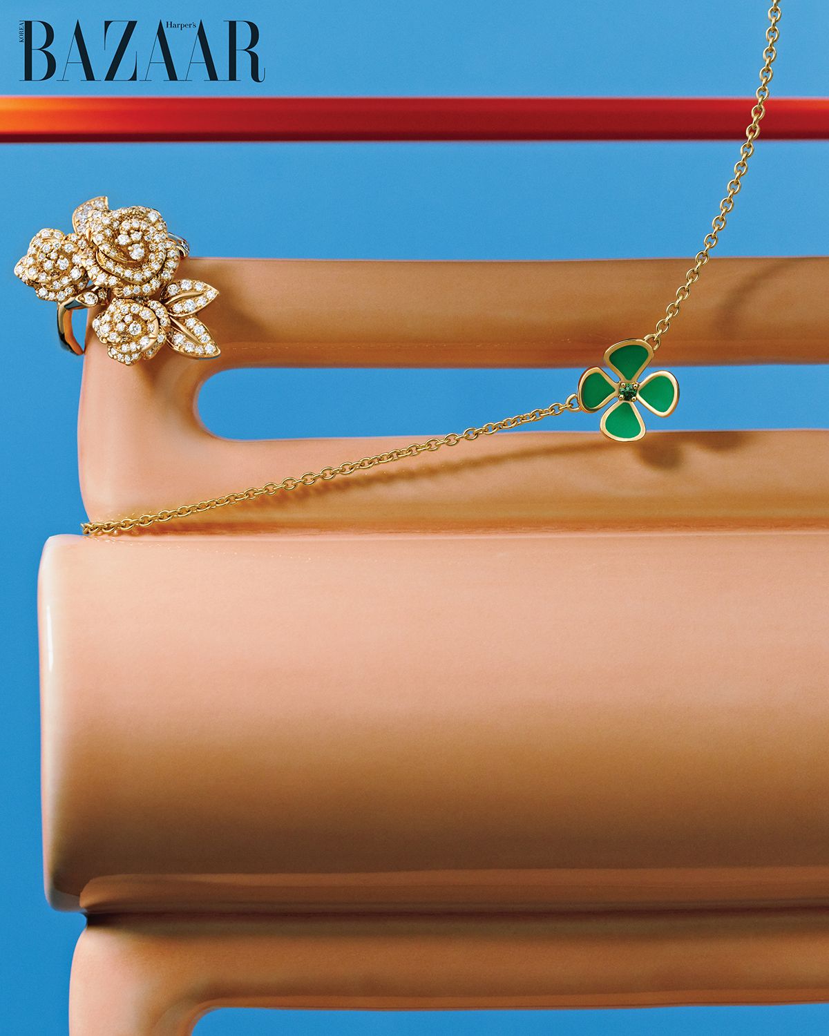 핑크 골드에 다이아몬드를 풀 세팅한 장미꽃 다발 형상의 ‘로즈 디올 바가텔’ 링, 차보라이트와 래커로 완성한 클로버 모티프의 ‘디오레트’ 네크리스는 Dior Joaillerie.