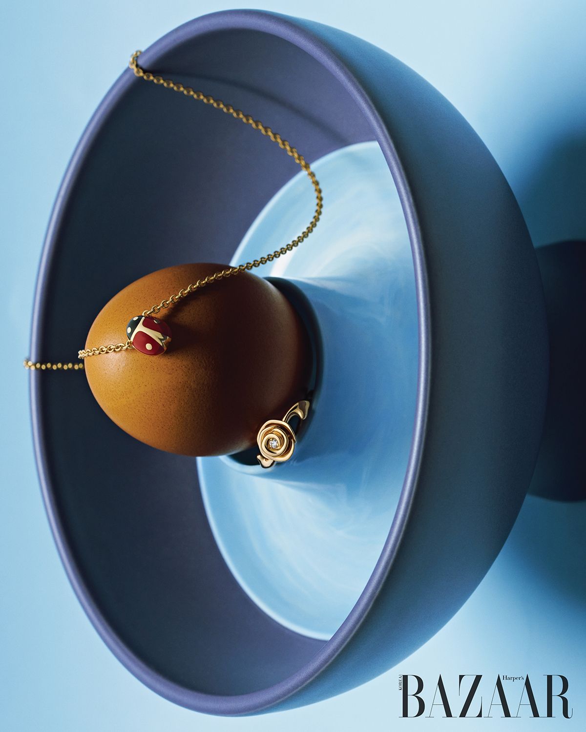 옐로 골드에 섬세하게 채색한 래커 소재를 더한 레이디버그 ‘디오레트’ 네크리스, 핑크 골드에 다이아몬드를 세팅한 ‘로즈 디올 꾸뛰르’ 링은 Dior Joaillerie.