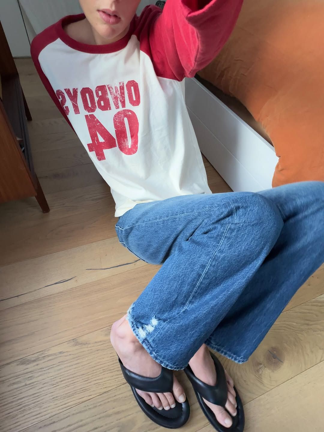 허리선이 낮게 설정된 로우 라이즈 부츠컷은 골반에서 시작되는 실루엣으로 일반적인 데님과는 다른 비율을 만들어낸다. 무릎 아래로 퍼지는 라인은 유지되지만, 다리의 시작점이 내려오며 상체와 하체의 대비가 강조되기 때문이다. 무릎에 페이드가 들어간 워싱은 허벅지 중심으로 시선을 모으며 부츠컷의 확장을 더 도드라지게 보이는 효과가 있다. 허리가 드러나는 체형이나 상체가 짧은 경우에 특히 효과적이며, 크롭 톱 외에도 슬림한 셔츠를 하이하게 넣어 입어 허리선을 위로 끌어올리는 연출도 유효하다. 플랫 슈즈는 팬츠 길이를 발등에 닿도록 설정해 실루엣이 끊기지 않게 매치해 볼 것.