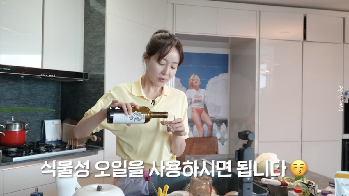 주방에서 올리브 오일을 꺼내 드는 엄지원의 아침은 오일 풀링이 첫 스텝이다. 꼭 올리브유가 아니어도 된다. 식물성 오일을 작은 컵의 반 정도의 양으로 따라준 다음, 약 5분 정도 입안 구석구석을 가글하는 게 그의 모닝 철칙. 양치도 하기 전에 먼저 이 오일 풀링을 하는데, 밤사이 입안에 쌓인 노폐물과 세균들을 오일로 흡착해 싹 헹궈내기 전까진 절대 물조차 마시지 않는다고.