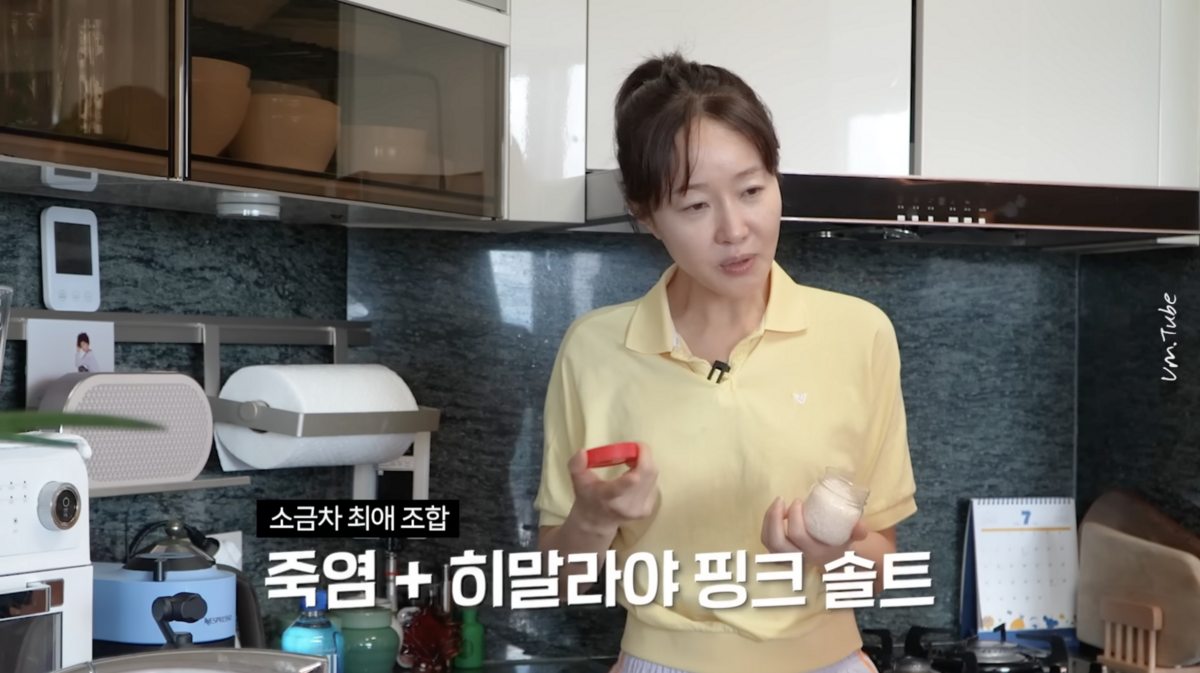 가글 후 개운하게 양치까지 마친 뒤엔 몸을 깨우는 따뜻한 소금차 차례다. 미네랄이 풍부한 죽염과 히말라야 핑크 솔트를 티스푼 1/4 정도 넣고, 끓는 물과 생수를 2:1 비율로 섞어 미지근하게 마셔준다. 체온과 유사한 미지근한 온도로 마셔야 유효 성분의 흡수가 비약적으로 빨라지니 너무 뜨겁거나 차가운 물은 자제해보자.