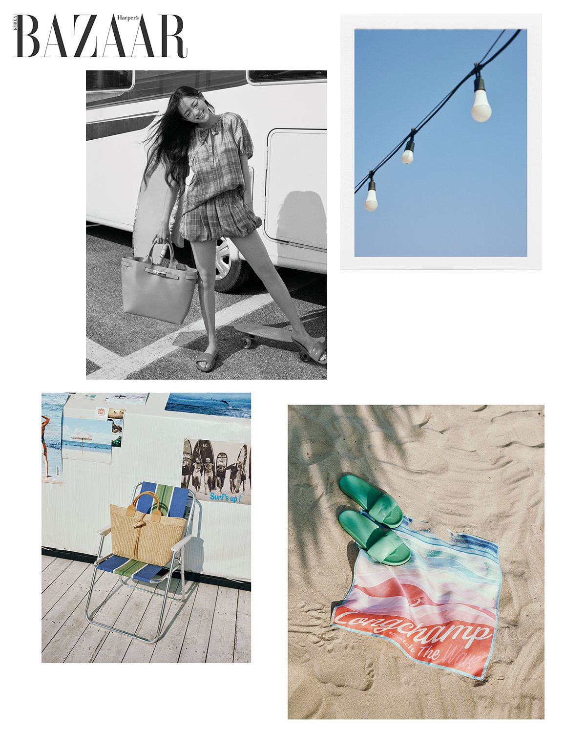 (왼쪽 위부터 시계 방향) 블라우스는 89만원, 쇼츠는 69만원, ‘르 스마트’ 토트백은 1백96만원, 슬라이드는 53만원 모두 Longchamp. 슬라이드는 53만원, 실크 스카프는 21만5천원 Longchamp. ‘르 로조’ 라피아 백은 1백17만원 Longchamp.