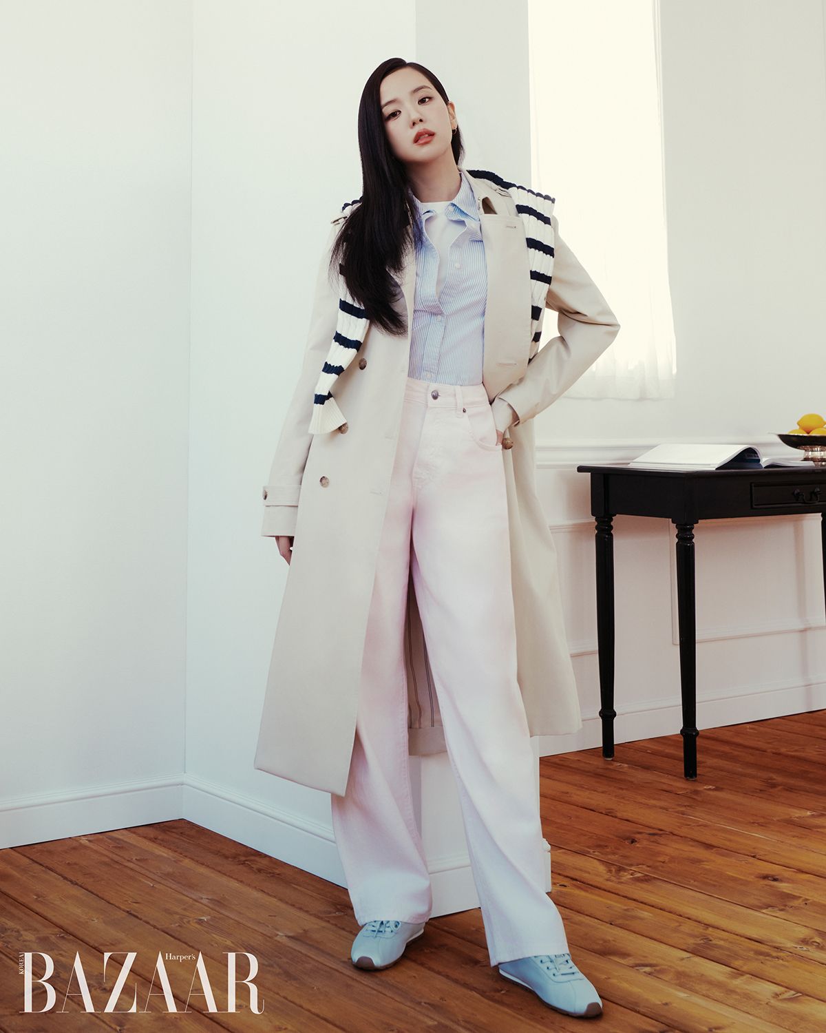 트렌치코트, 셔츠, 이너 톱, 데님 팬츠, 어깨에 걸친 카디건, 스니커즈는 모두 Tommy Hilfiger.