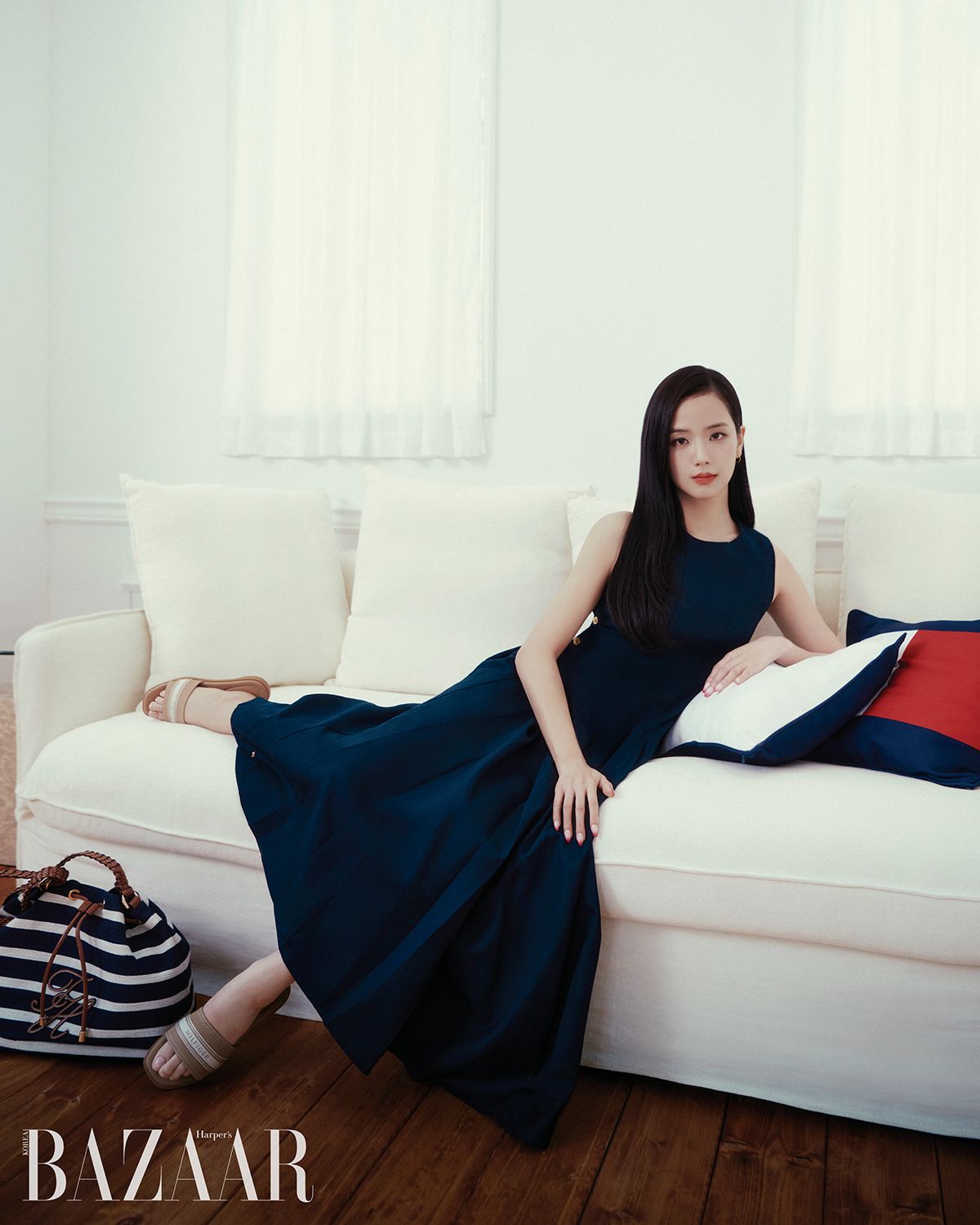 드레스, 슬라이드, 소파 아래 놓인 스트라이프 패턴 버킷 백은 모두 Tommy Hilfiger. 귀고리는 스타일리스트 소장품.