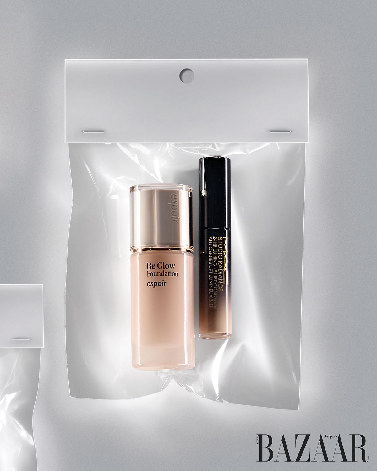 피부가 예민해져 결이 거칠고 톤이 칙칙해졌을 때 유용하다. 특히 웨딩 데이같이 감정 소모가 큰 날, 베이스가 잘 받지 않을 때 ‘응급 솔루션’처럼 활용하고 있다. 결이 곱고 밀착력은 뛰어나지만 컬러와 광택이 아쉬운 맥 컨실러에 에스쁘아 비글로우 파운데이션을 더하면 화사함과 광이 보완된다. 뿐만 아니라 들뜸 없이 균일한 피붓결을 연출한다. 피부톤이 비교적 안정적일 때는 맥 컨실러를 얇게 펴 발라 밀착력 있는 바탕을 만든 뒤, 광택과 화사함이 필요한 부위에만 비글로우 파운데이션을 루비셀 퍼프로 가볍게 터치한다. 컨디션이 많이 떨어진 날에는 두 제품을 1:1로 섞어 사용한다. - 우현증메르시 메이크업 아티스트 우현증