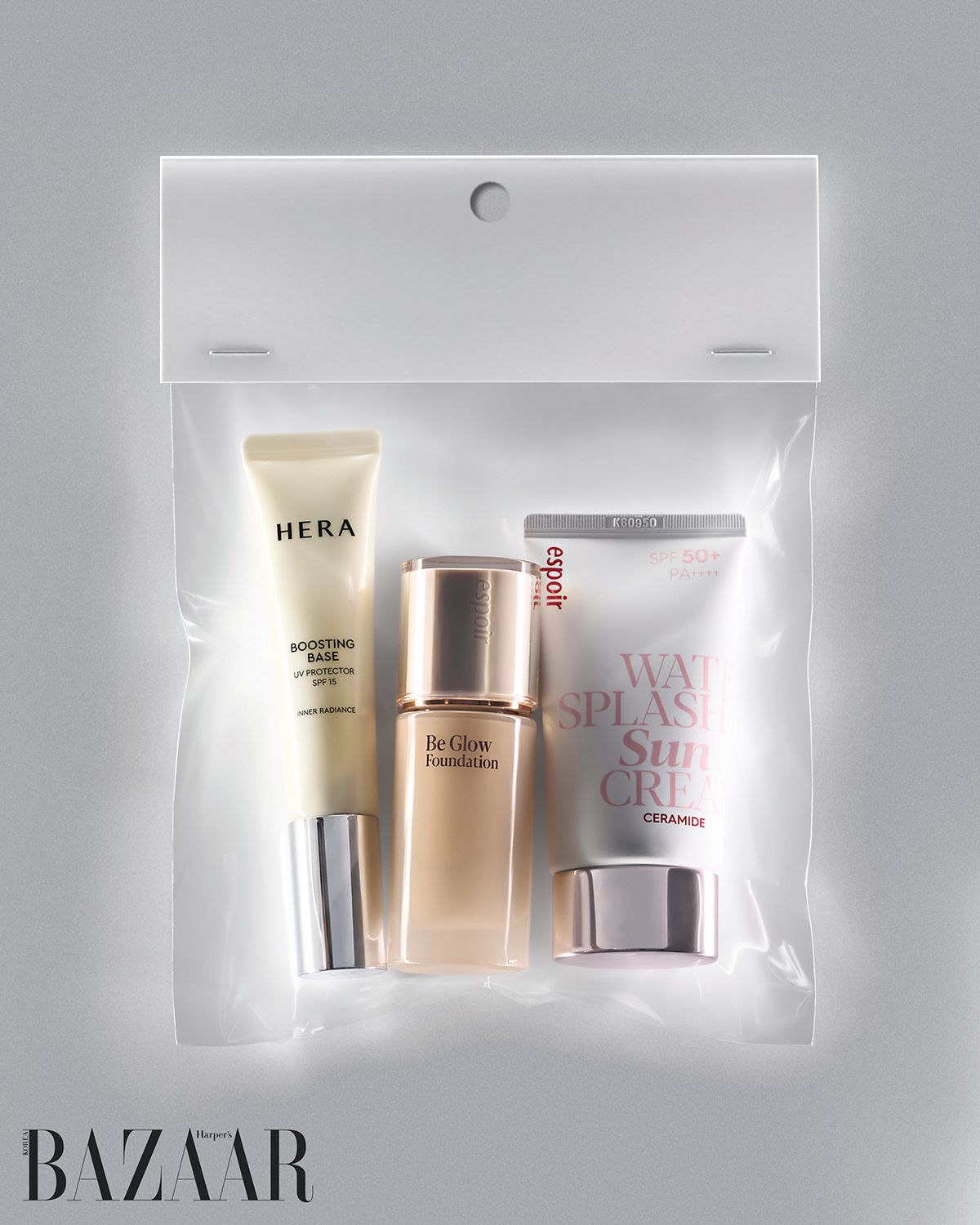 “피부가 이토록 예쁘게 빛난 적이 없다”는 극찬을 받은 조합. 세 제품 모두 가볍고 촉촉해 여러 겹 레이어링해도 답답하지 않다. 수분이 차곡차곡 쌓이며 오랜 시간 윤광을 유지하는 것도 장점이다. 헤라 부스팅 베이스를 손으로 부드럽게 펴 발라 피부에 유연함을 더하고 결을 정돈한다. 에스쁘아 선크림 역시 손의 온기로 누르듯 흡수시키면 피부 톤이 한층 화사해진다. 여기에 비글로우 파운데이션을 납작 브러시로 얇게 도포한 뒤 미스트를 머금은 스펀지로 고정시키면 탱글한 광채 피부가 완성된다. - 프리랜스 메이크업 아티스트 김유미