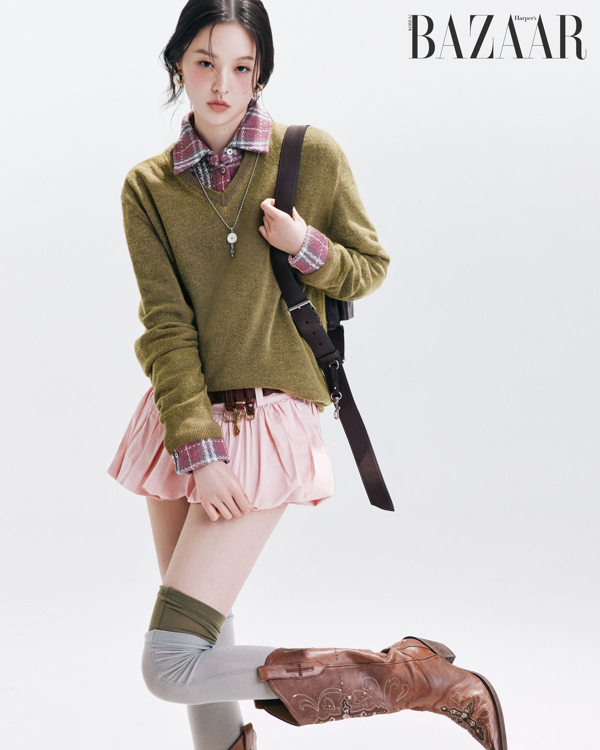 니트 톱은 Maison Margiela. 체크 셔츠는 1백38만원 Golden Goose. 스커트는 Kenzo. 귀고리는 11만원대 Tokokkino. 목걸이는 Chrome Hearts. 숄더백, 벨트는 Miu Miu. 니하이 삭스는 4만원대 Open Yy. 부츠는 23만원대 1Jinnstudio.