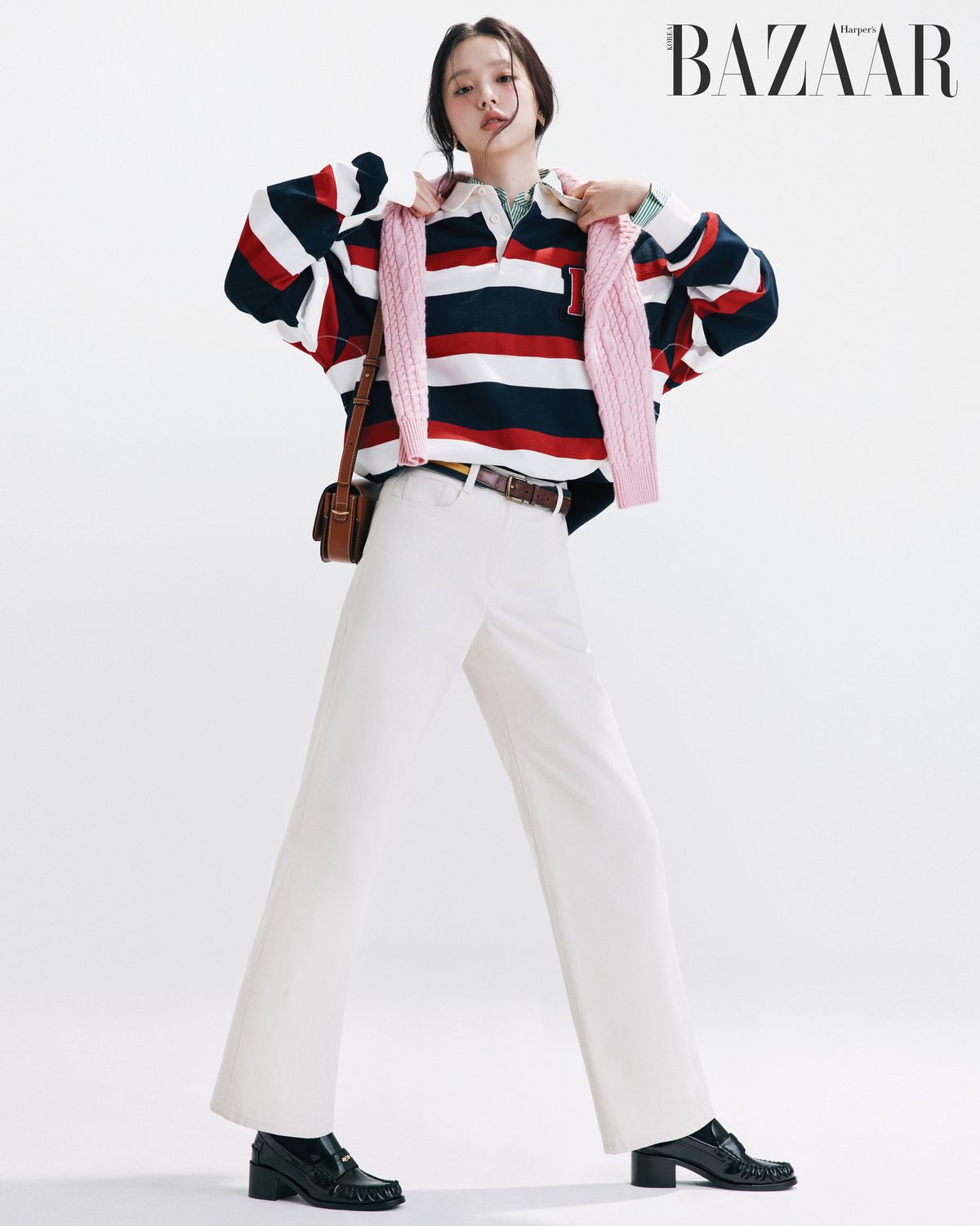 스트라이프 럭비셔츠, 이너로 착용한 셔츠, 팬츠, 숄더백, 로퍼는 모두 Tommy Hilfiger. 어깨에 걸친 니트 톱은 Dior. 귀고리는 Gucci. 벨트는 Polo Ralph Lauren. 양말은 에디터 소장품.