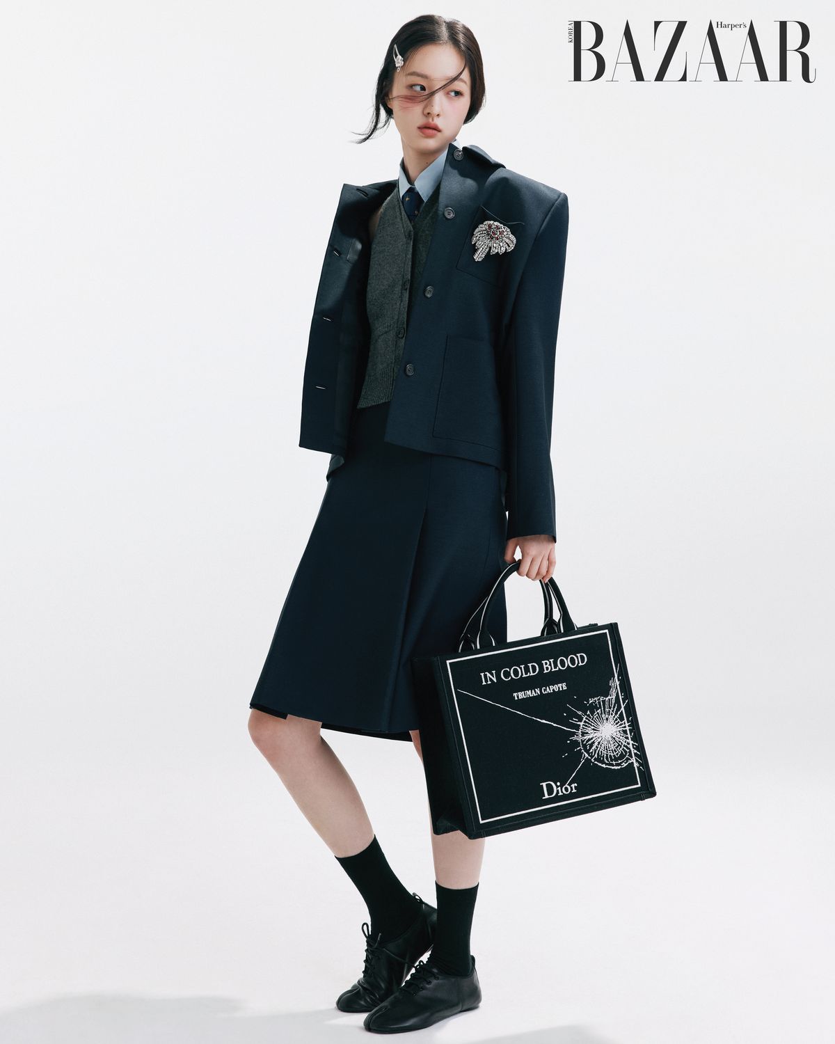 재킷, 카디건 베스트, 셔츠, 스커트는 모두 Miu Miu. 헤어 클립, 타이는 Vivienne Westwood. 브로치는 N°21. 톱 핸들 백은 Dior. 양말은 Loro Piana. 레이스업 로퍼는 Maison Margiela.