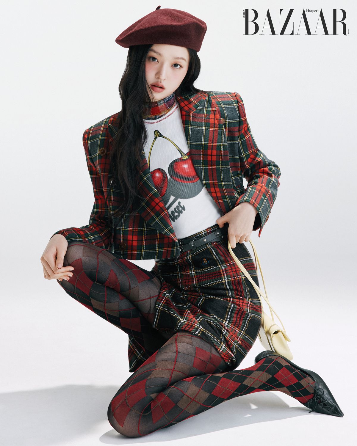 체크 패턴 재킷, 터틀넥 톱, 스커트는 모두 Vivienne Westwood. 체리 프린팅 톱은 Diesel. 베레는 Maison Margiela. 벨트는 16만원대 Open Yu. 톱 핸들 백은 Chanel. 펌프스는 Jimmy Choo. 타이츠는 에디터 소장품.
