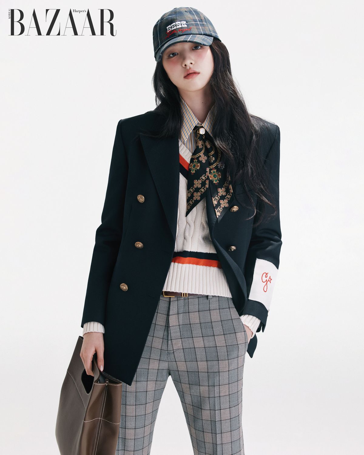 재킷은 Golden Goose. 니트 톱은 Lauren Ralph Lauren. 셔츠는 Burberry. 팬츠는 Acne Studios. 볼캡, 벨트는 Eenk. 스카프는 Dolce & Gabbana. 스카프에 끼운 반지는 Gucci. 토트백은 Loro Piana.
